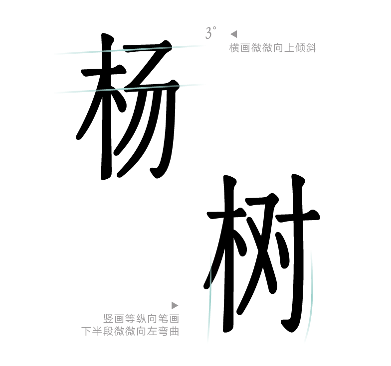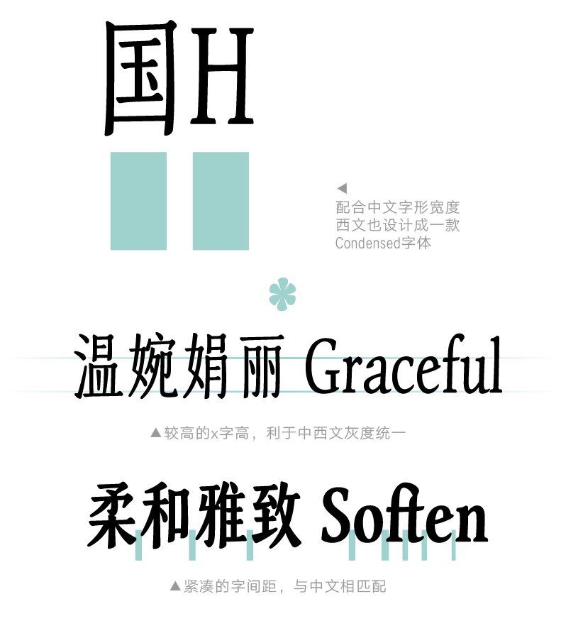 设计师创作该字体时,着重强调结构的书写感。横画微微向右上倾斜,大量竖画蕴含向左倾斜的微妙弧度,如斜阳柳树、梨花细雨、晚风残烟,恬静中带有一丝动感。
