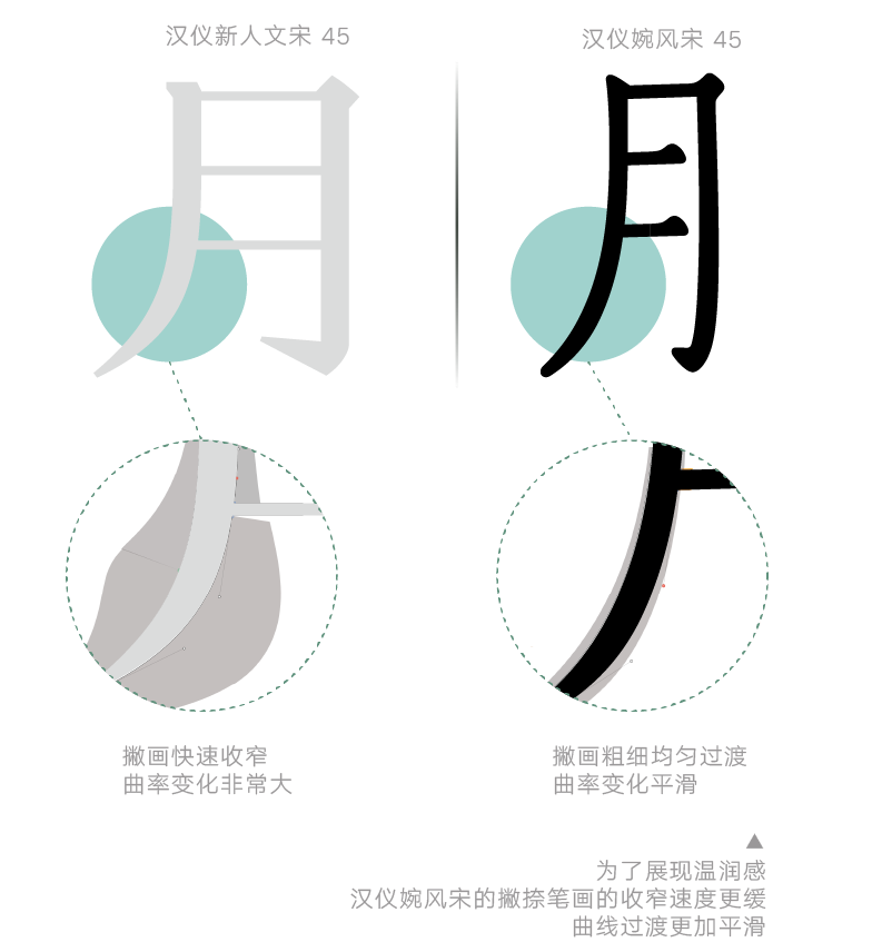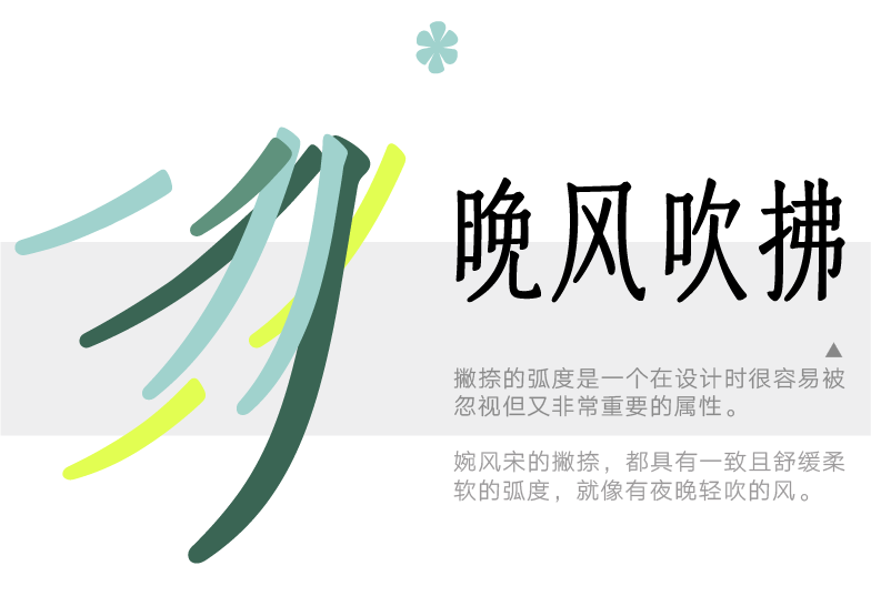 该字体特别重视字形轮廓曲线的质感:布点简练、轮廓丝滑如玉,彰显简约之美。而相较于一般宋体,汉仪婉风宋的撇、捺等笔画有着更为舒缓柔软的弧度,更为细腻的粗细变化,有如晚风吹拂,为字形带来独特的记忆点。