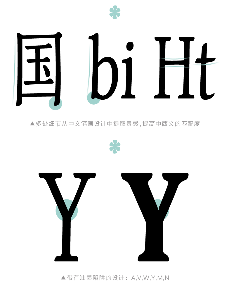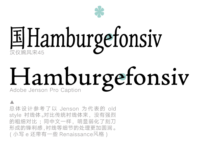 汉仪婉风宋家族的西文部分由汉仪字库的西文设计师史贺达设计。字形瘦长、衬线粗厚、字干有一定弧度,挺拔如修竹、温婉如流水,与中文字形特征相符。风格复古、经典、强调手写感,有利于营造出自然且古典的气氛。