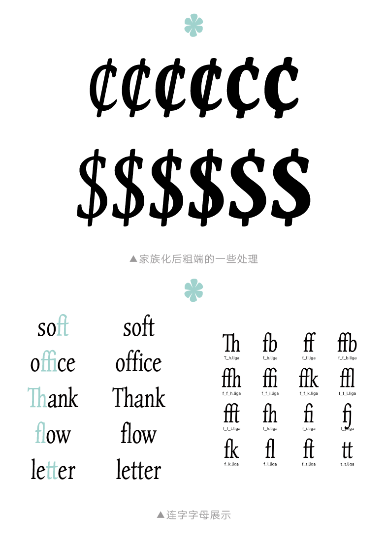 为了传递出温婉的气氛,这款字体的笔画每一个转角处,几乎都是由曲线构成的。这种处理方式收敛了刻本字的原本的凌厉与古拙之气,让字形尽显温婉之美。