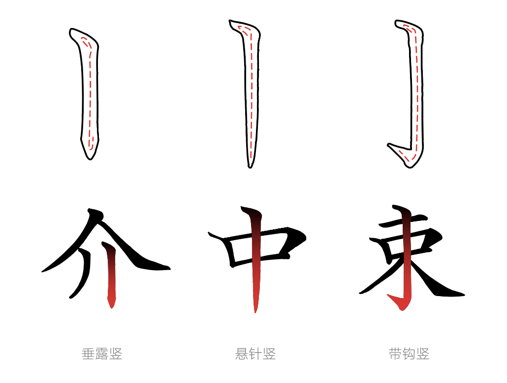 汉仪字酷堂荫嘉楷书的竖画有三种写法。它们的起笔相同,都是先逆锋向左上起笔,然后向右下轻顿后向下行。不同之处在于它们的收尾,垂露竖行至末尾稍驻即回锋收笔;悬针竖行至大约四分之三后向下边走边提,出锋迅速稳健;带钩竖尾部出锋向左钩出,使下部有上托之势。