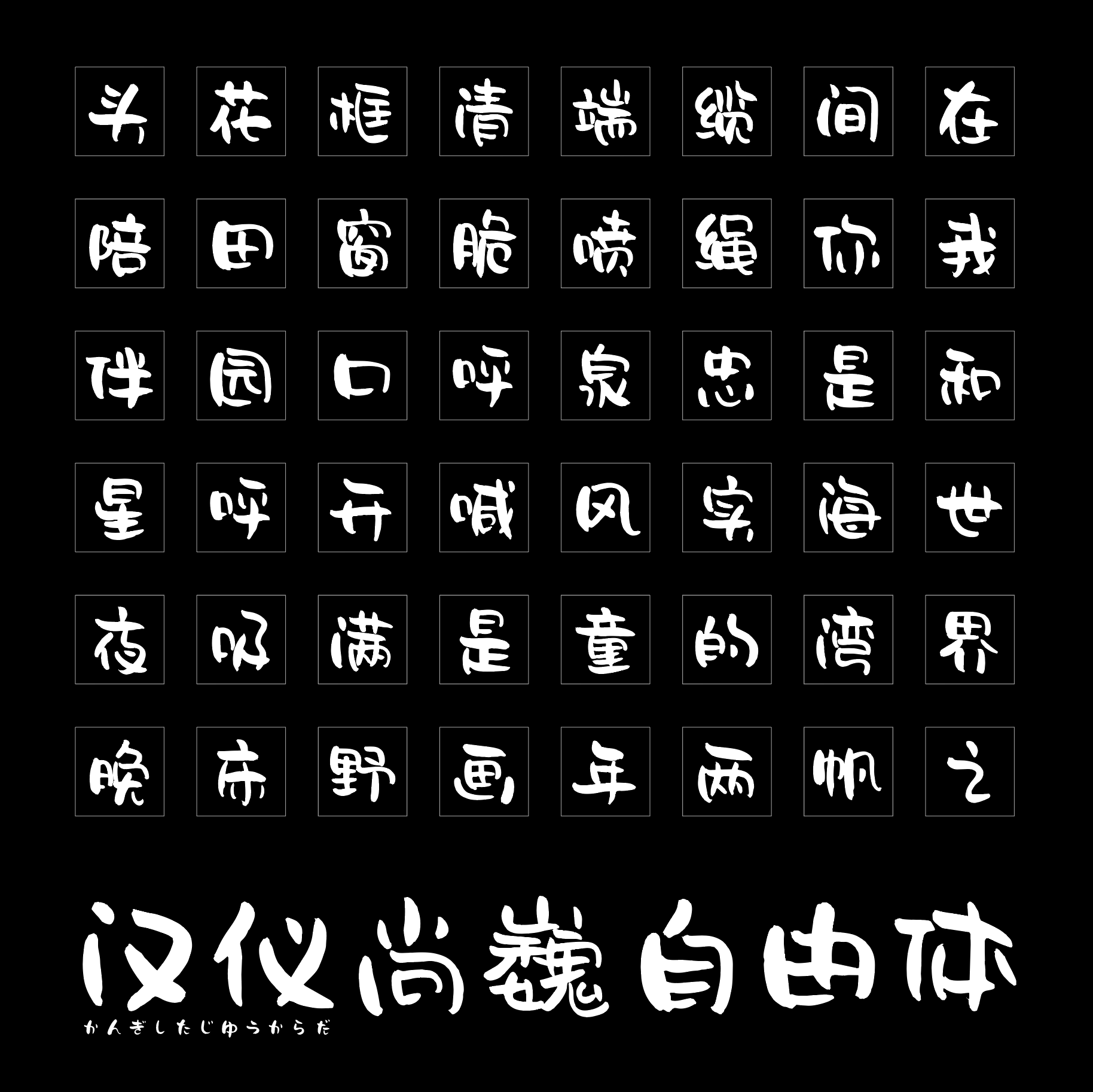 汉仪尚巍自由体的字形偏圆。无论是左右结构还是上下结构的文字,都在保证识别度的基础上给予笔画不同程度的变形,自然洒脱的笔画让字体变得圆圆滚滚,有亲切感。