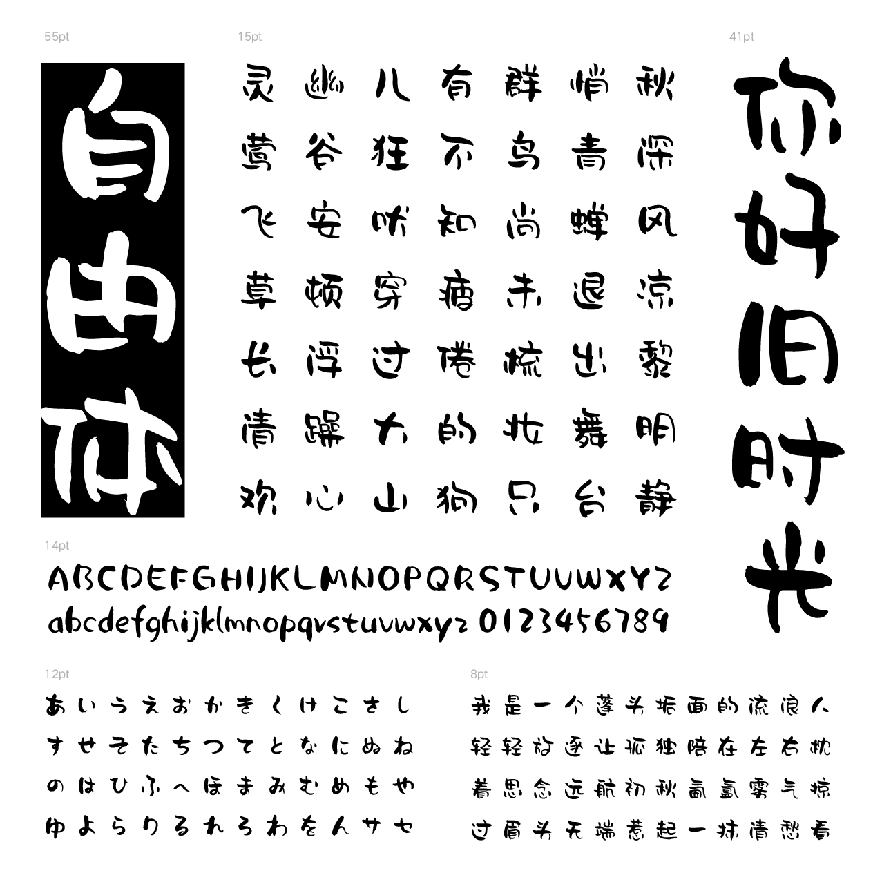 汉仪尚巍自由体的西文同样使用毛笔书写,形成了带有朴拙韵味、风格轻松愉悦、自由自在的字母。中西文搭配使用时和谐统一。