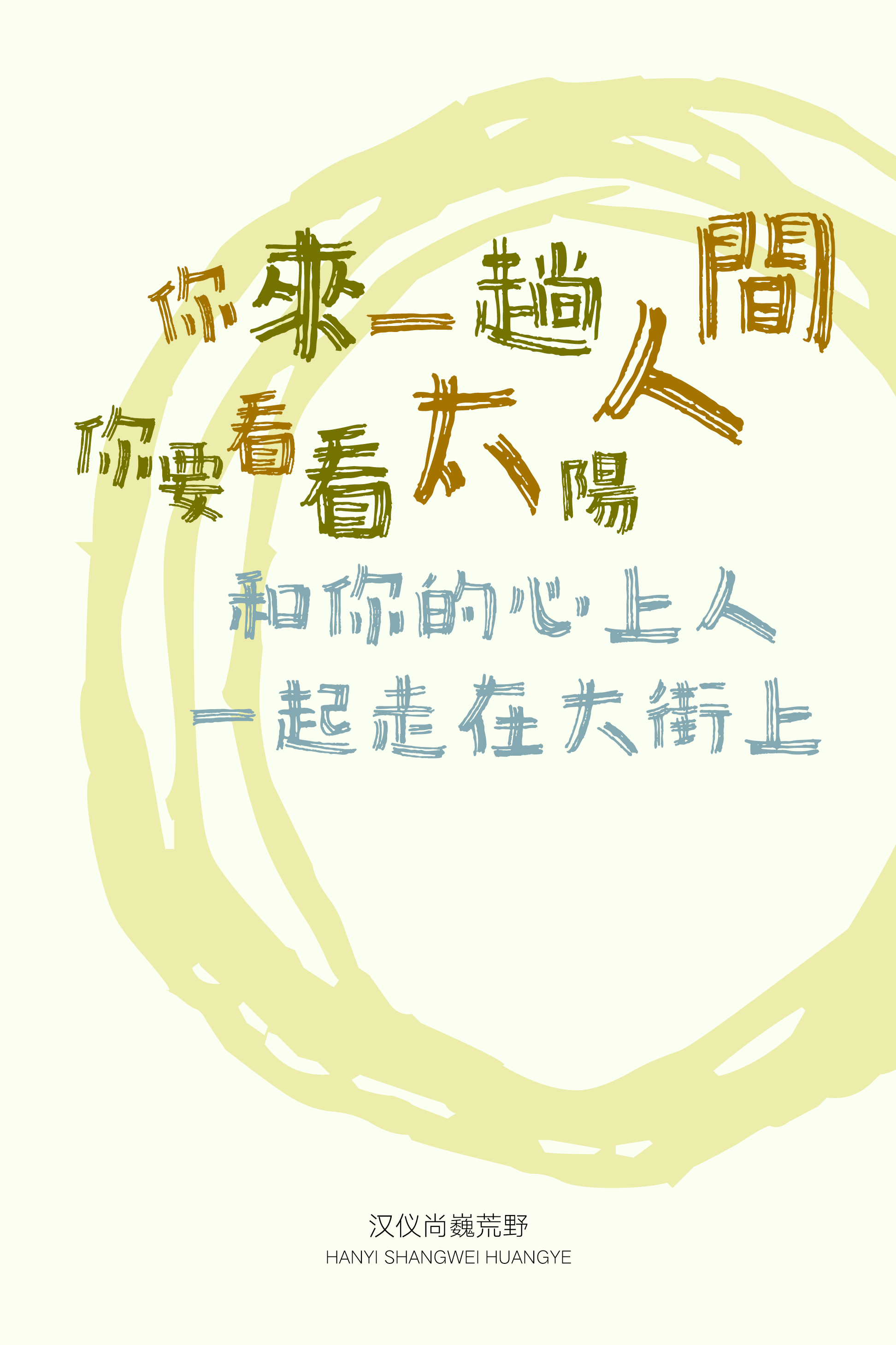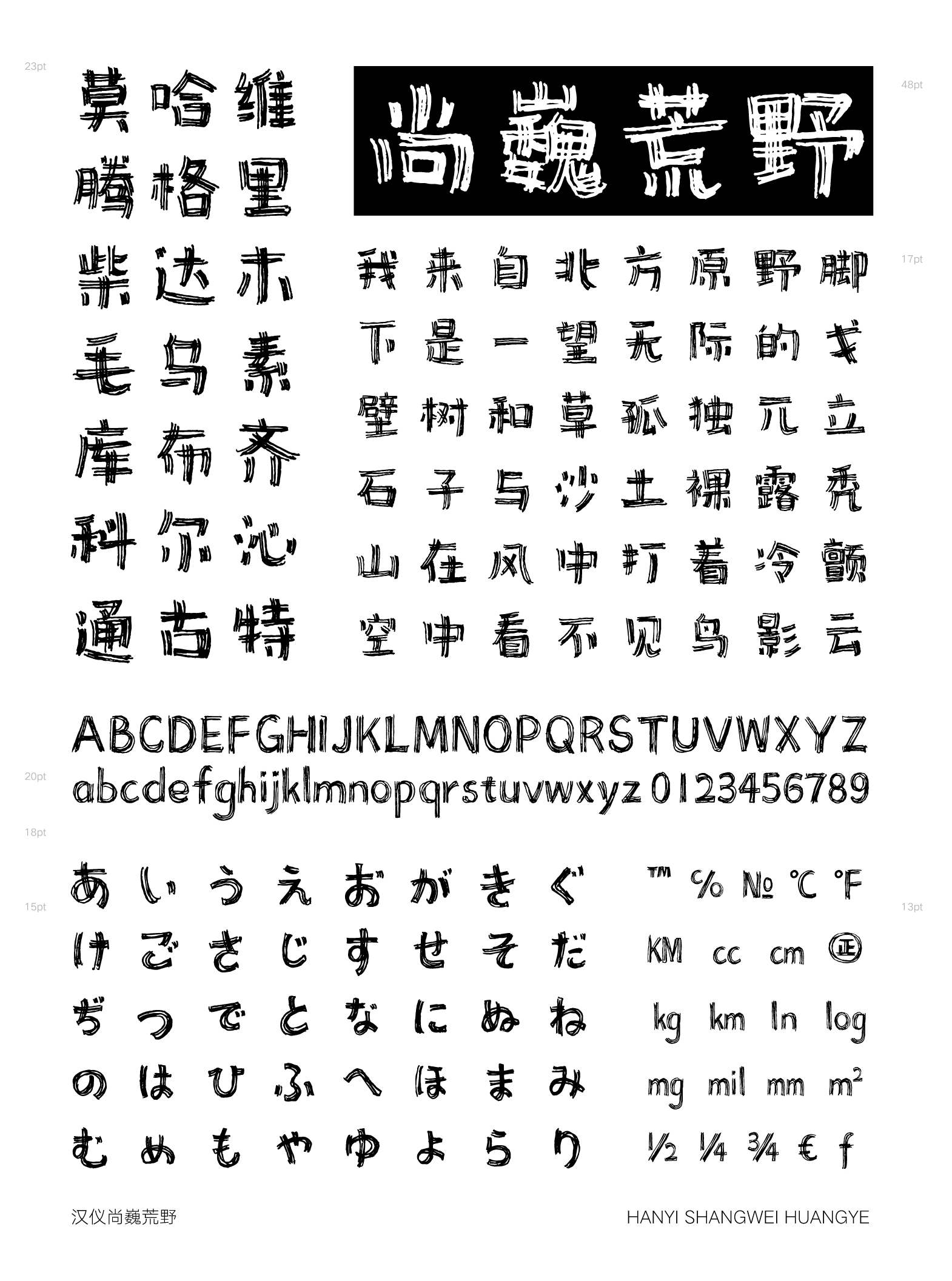“汉仪尚巍荒野”出自汉仪字库签约设计师尚巍。他是一个行走于机打时代的手写人、跨界设计师、美学创意人、书法创作人;他是一位90后,却花了20年的时间不断诠释他对书法的情怀;他在这个浮躁的年代,坚持着自己的手写风格,不骄不躁;他被称作是一个带着传统,却敢倒立行走的新生代艺术家。