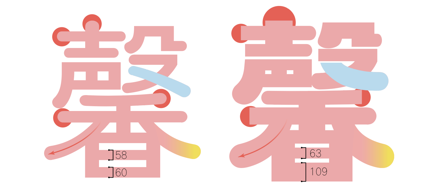 与汉仪懒圆圆对比:字的白空间更多,布白均匀,更有呼吸感。笔画粗细差异小,撇捺更长更舒展。笔画起收笔都是圆弧形,收笔圆弧稍大,但没有汉仪懒圆圆笔画差异明显。