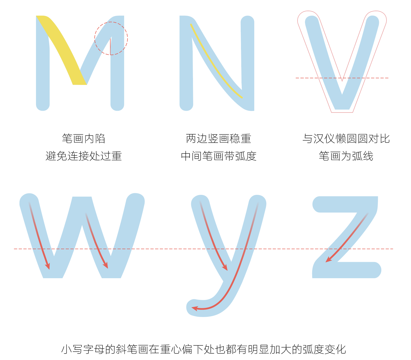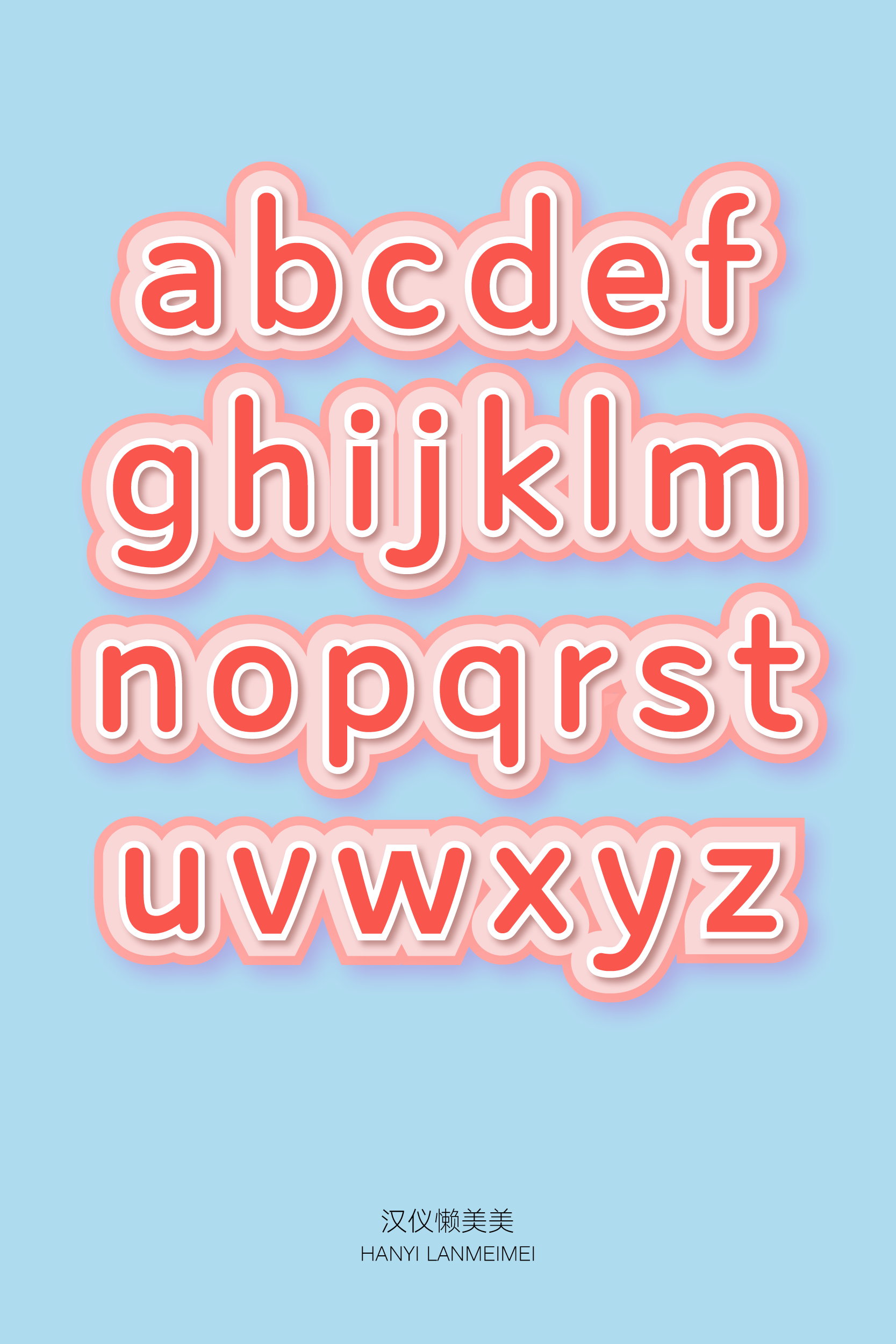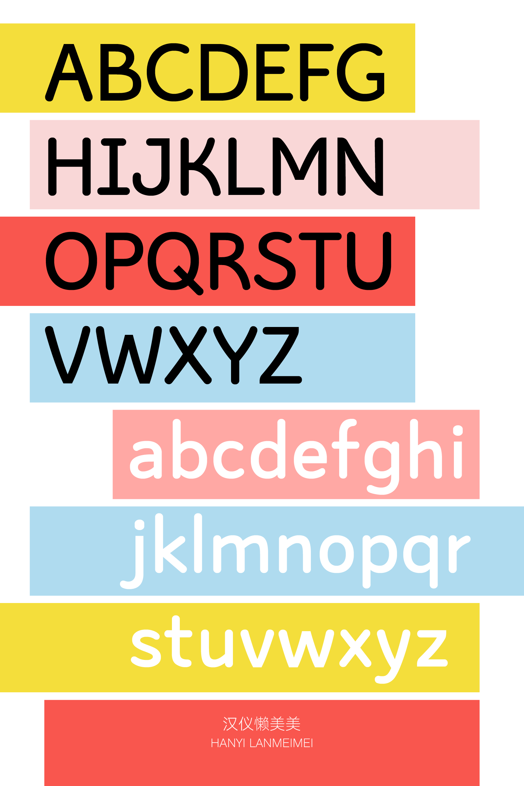 “汉仪懒美美”的西文为柔和的无衬线字体。字形瘦长,横平竖直,斜画为弧线。绝大多数笔画的起收笔都是弧线,与中文设计风格一致,搭配和谐。