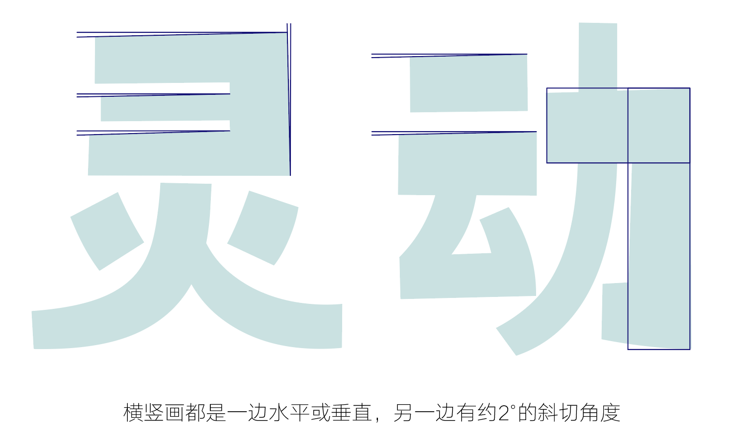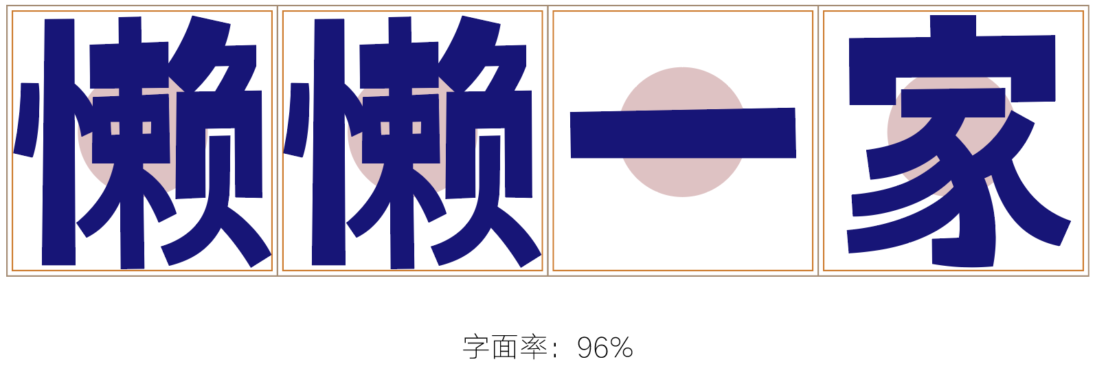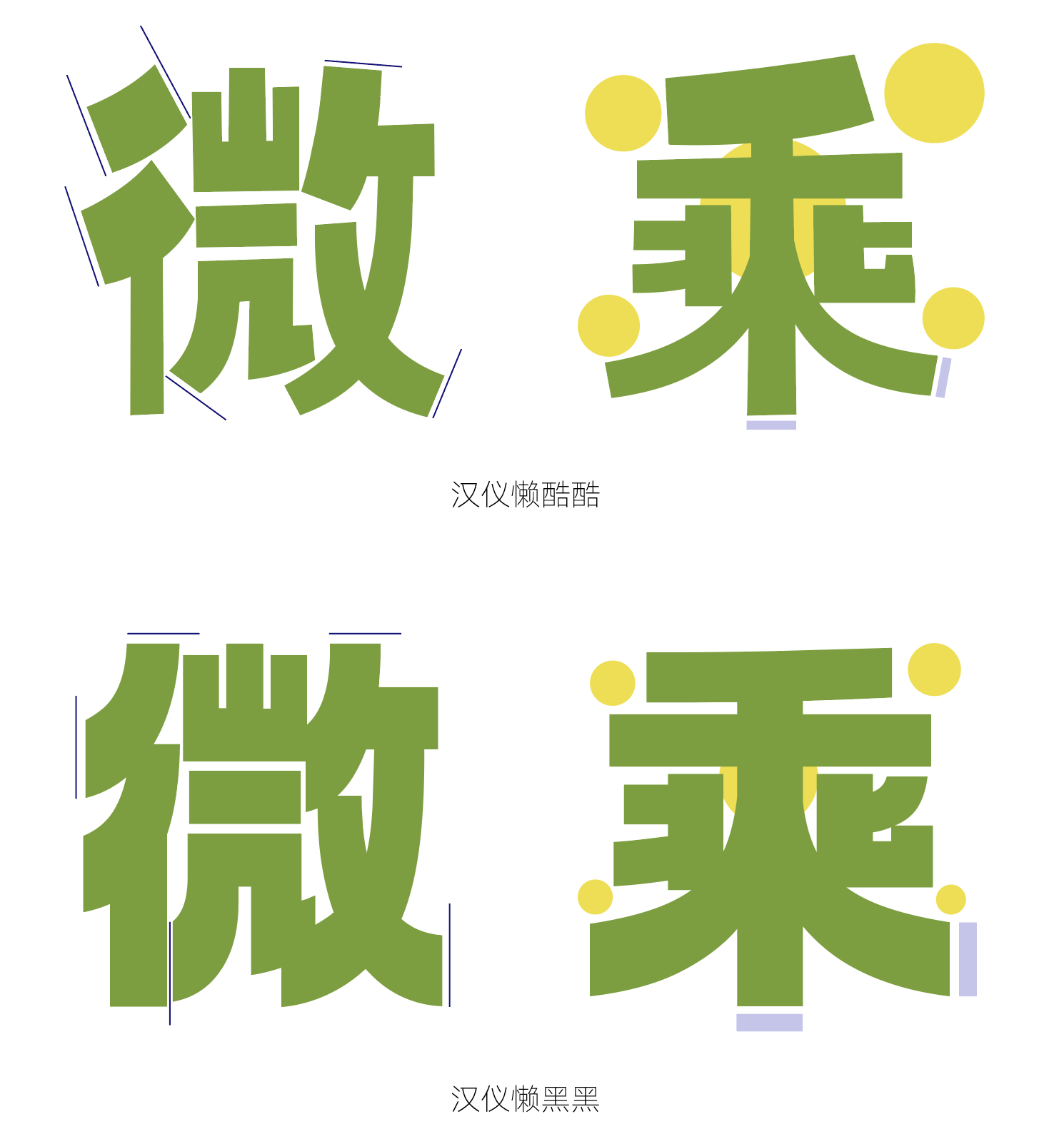 与汉仪懒黑黑对比:重心更偏上,空白空间增大,整体更青春、活泼。笔画粗细对比差异大。笔画终端为斜切,角度、粗细变化丰富。