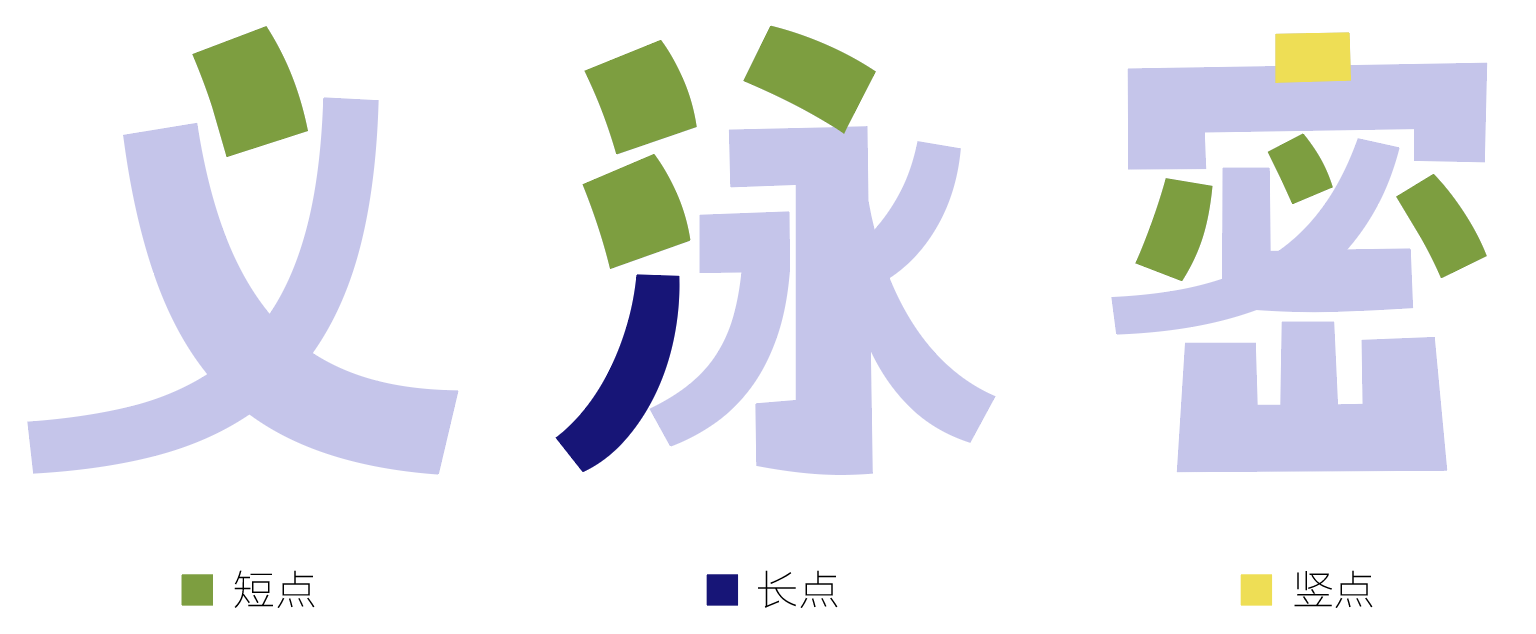 不同点画的起收笔粗细变化小。短点弧度小, 长点略有弧度,竖点非水平垂直线也无弧度。