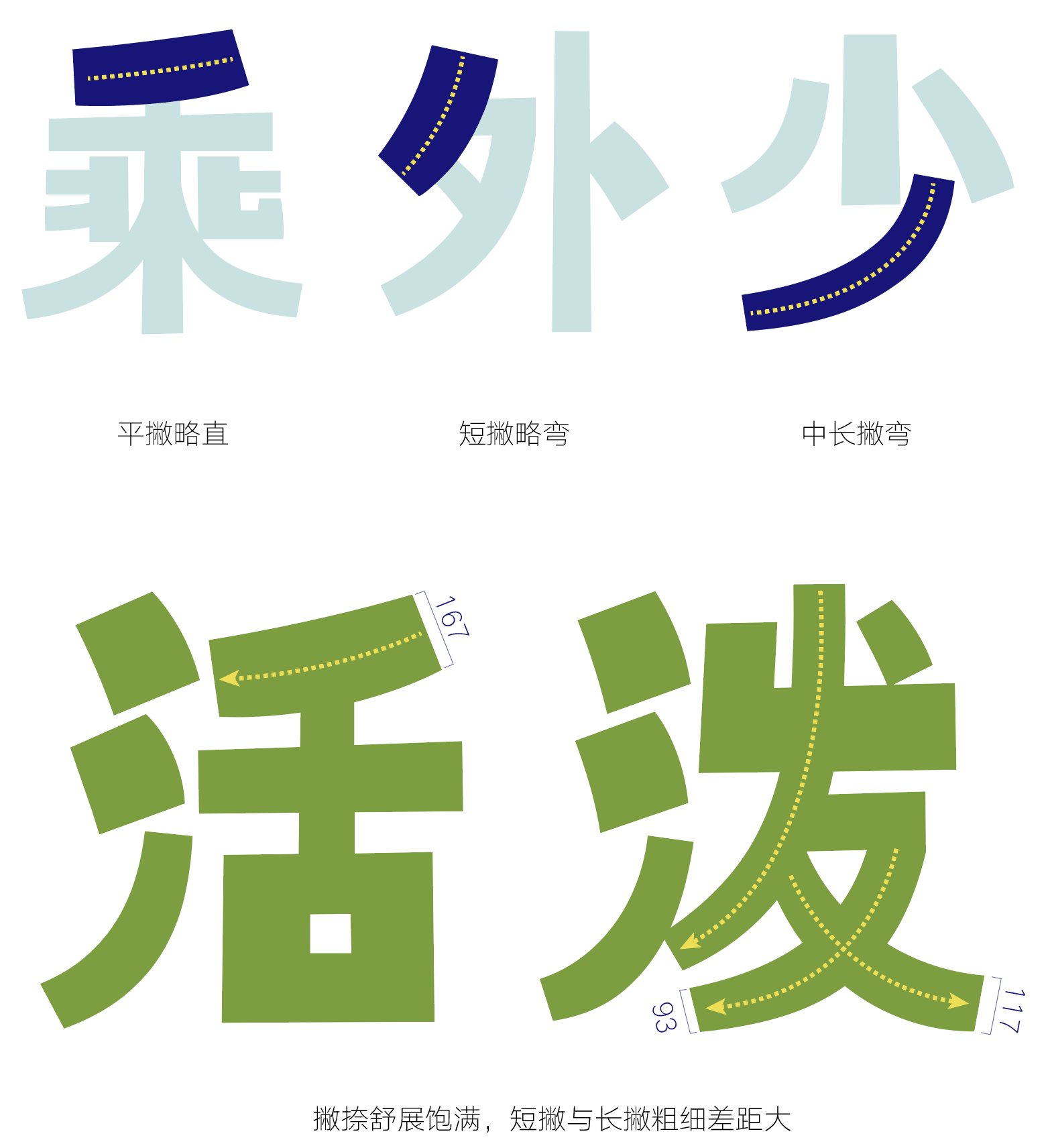 撇画外线弧度比内线弧度增大,起笔粗收笔略细。