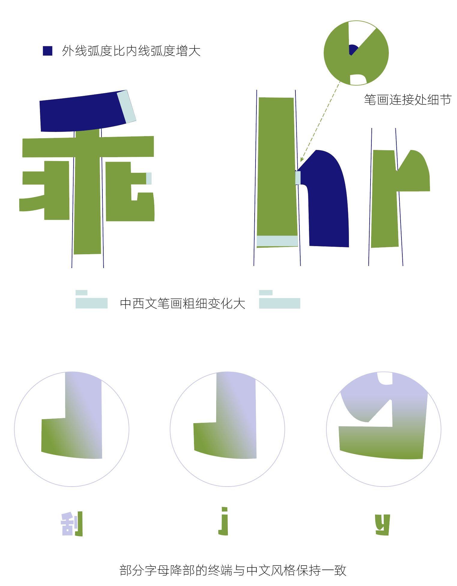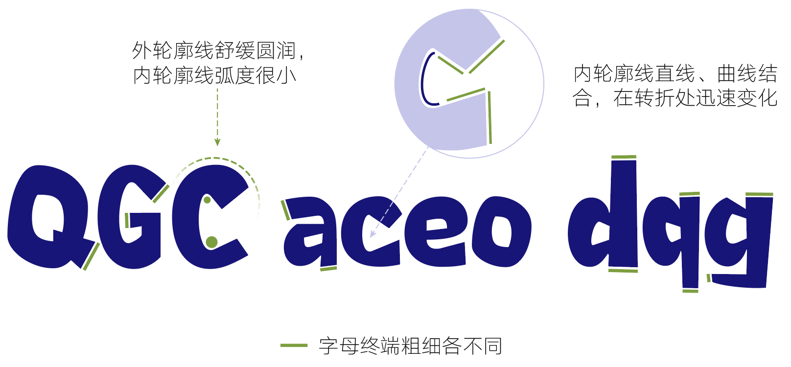 所有带弧形的字母都设计成粗细不等的弧线。外轮廓曲线舒缓圆润;内轮廓线则是直线、曲线结合,在转折处迅速变化,灵活生动有动势。终端粗细都不同,打破了其他字母的粗壮稳定,显得可爱调皮又有亲和力。