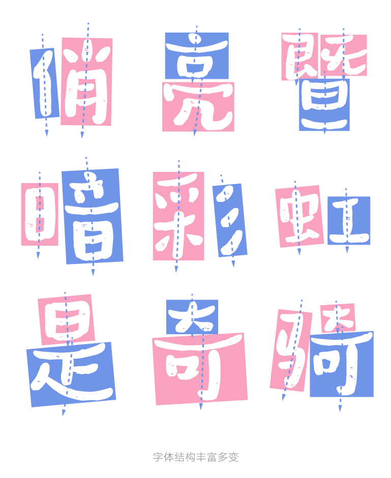 设计师通过减少笔画的衔接来放大字形内部的布白空间,增加了字形的疏朗感和通透感。透过随性的笔画,整款字体在视觉上显得更加轻松自然。