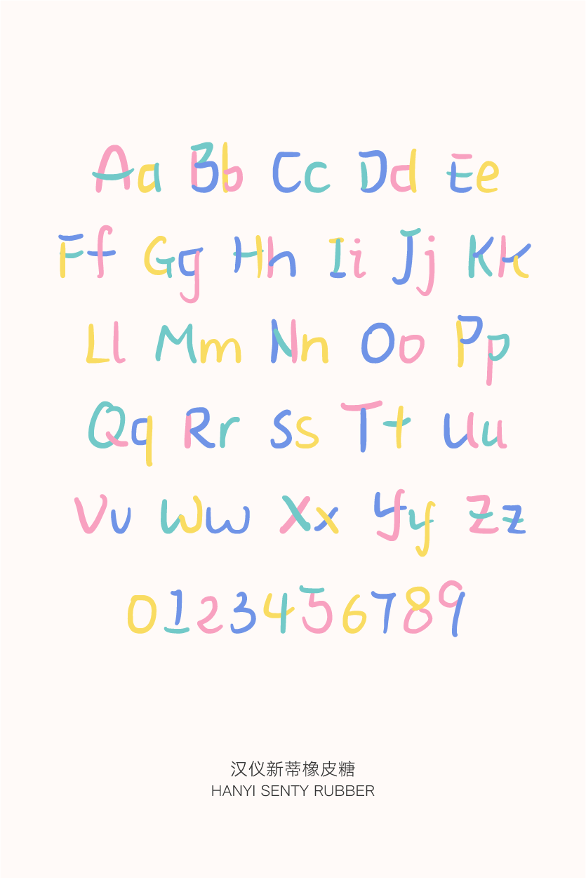 汉仪新蒂橡皮糖是一款活泼、可爱、稚拙的手写字体。字形圆润有弹性、结构开阔疏朗,给人糖果般Q弹、甜美、灵活、俏皮的视觉感受。这款字体适合排一些较短的文案,用在产品包装、广告宣传、游戏动漫、书籍、杂志等多种场合。