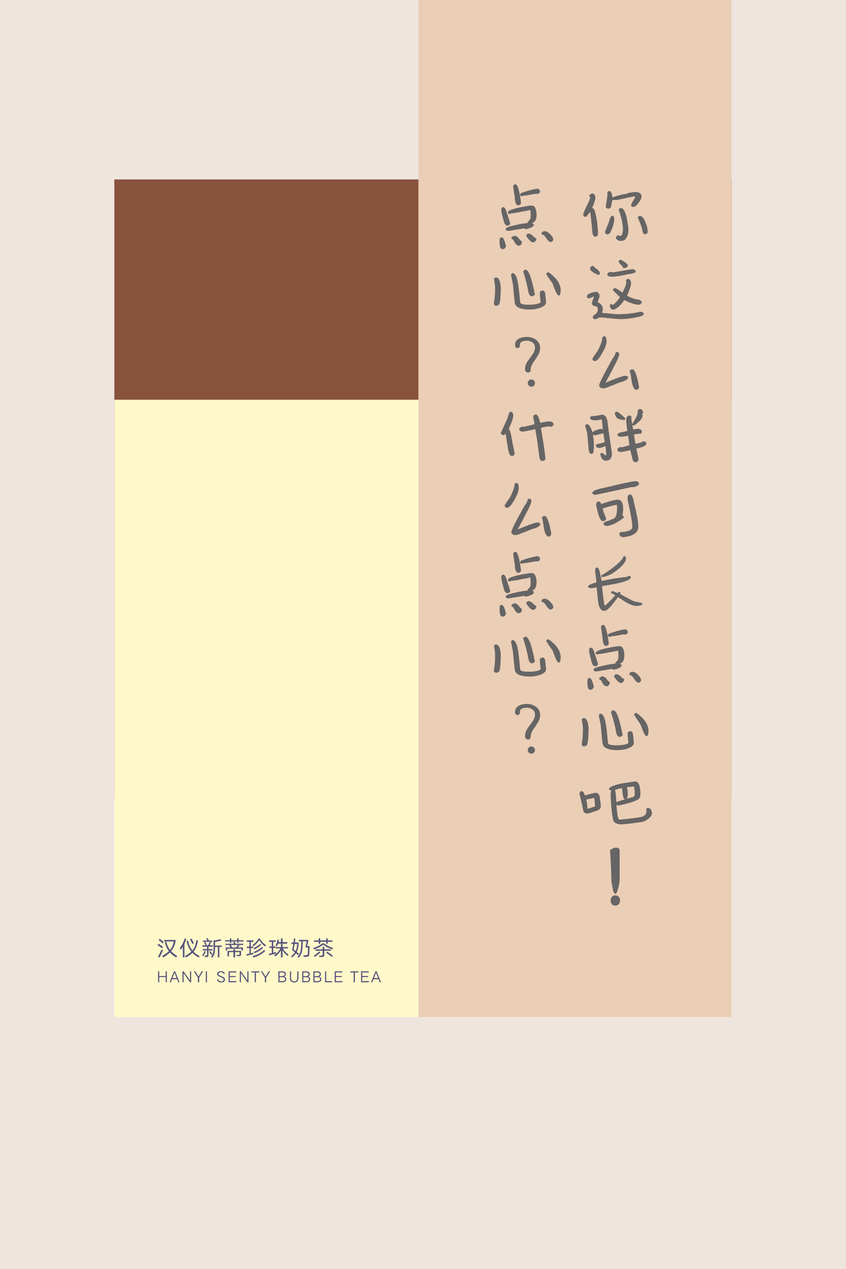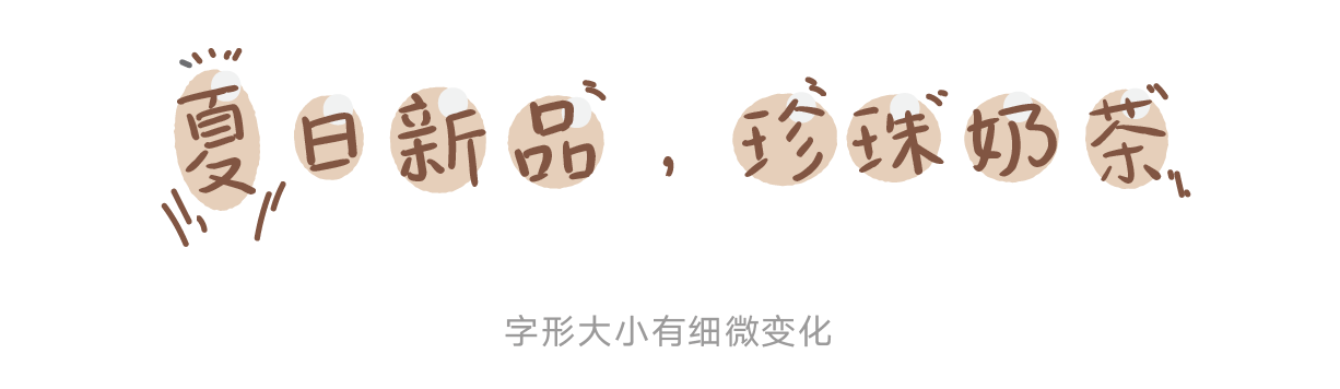 “汉仪新蒂珍珠奶茶”的笔画错落摆放,道道精简、笔笔分明,减少书写连笔,使得字形看起来更加稚拙可爱,增添新鲜感。