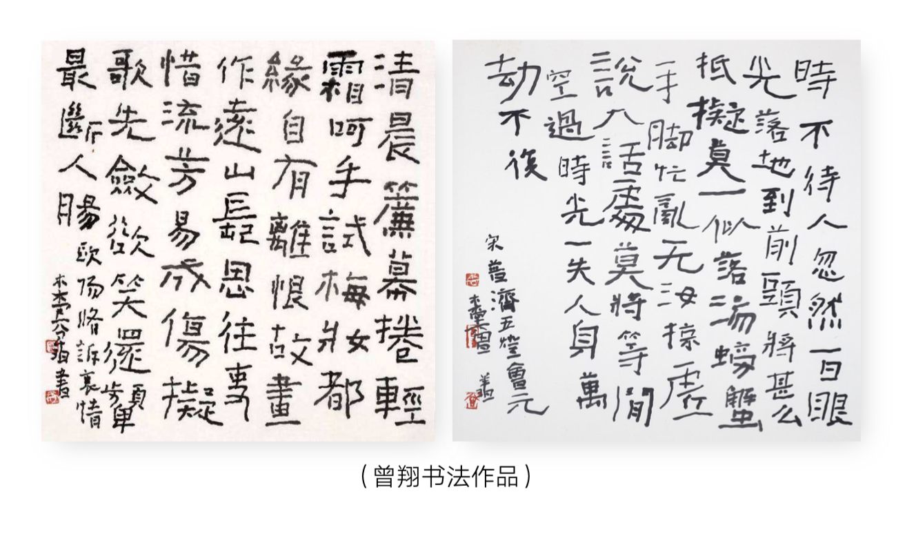 曾翔毕业于解放军军事学院,从一名普通军人到享誉当代书坛的书法家,师从王任、刘炳森、沈鹏先生,打下了深厚的书法根基。被公认功夫过硬,结构造字能力强,笔性佳,并以其鲜明的艺术个性辉映了当代书坛。他是个智者,书艺精于诸体,转益多师,又能独辟蹊径,放胆变通。