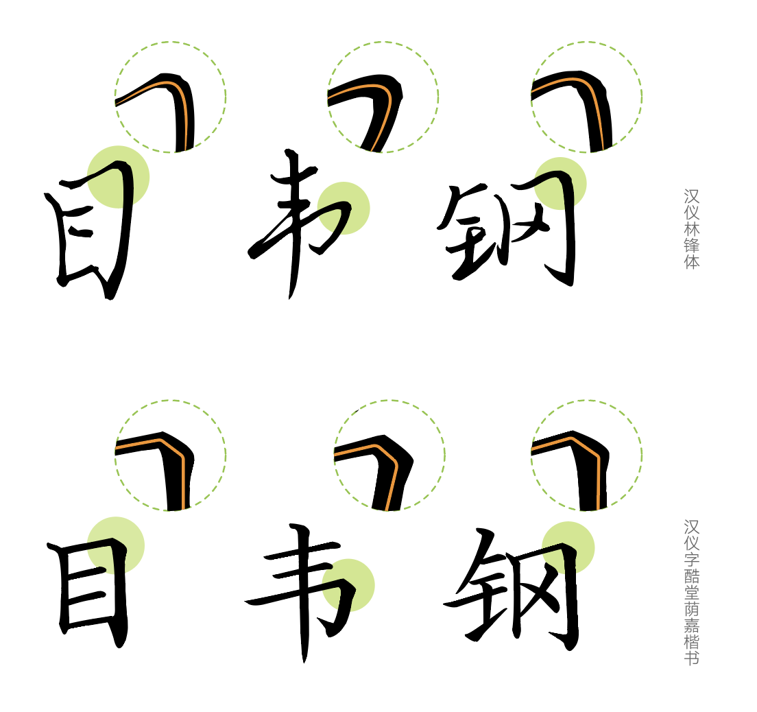 汉仪林锋体的笔画转折方圆兼备。在楷书中,横折和竖折处都是十分方正的折角,而汉仪林锋体转折处多采用草书圆转的写法,以圆代方、以曲代直,所以显得笔势流畅,玲珑流利,有一种活泼、自然的流动感。