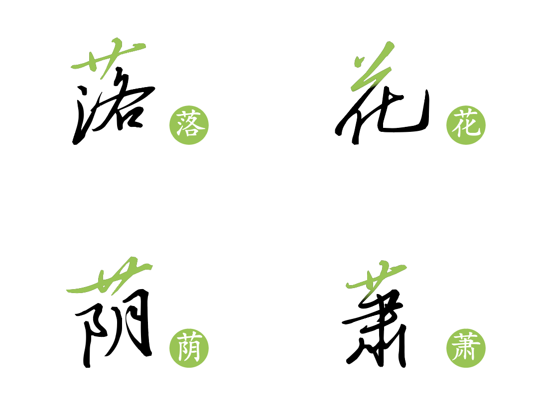 汉仪林锋体的表现力丰富,一个部首笔画有多种写法,体态多变,姿态各异。如“落、花、荫、萧”同是草字头,但写法各不相同,生动活泼,耐人寻味。