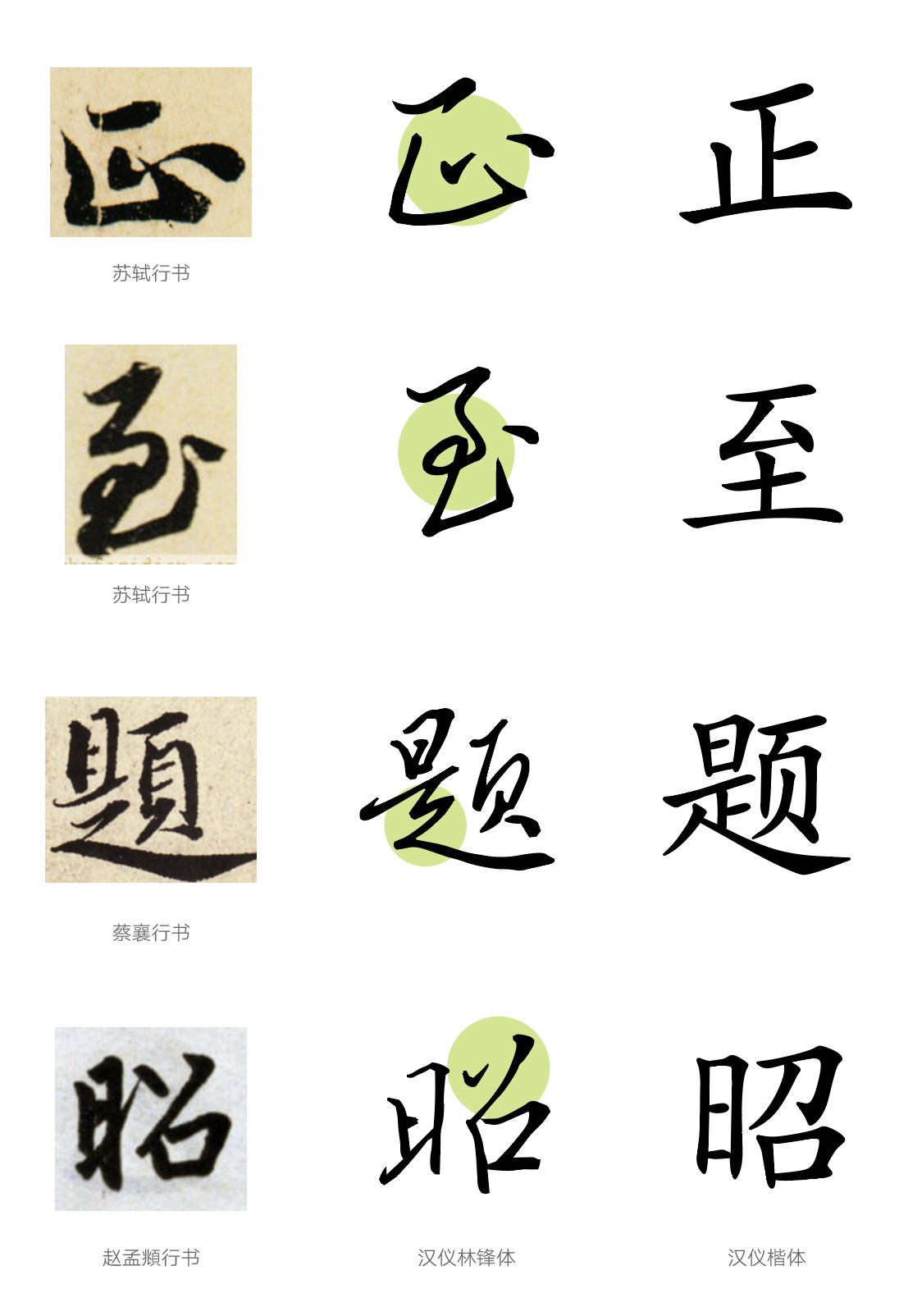 行书为了书写简便,对楷书的某些部位或笔画有意地进行恰当的简化,在不失原来字形、字意的情况下,或减省笔画,或合并线条。因此汉仪林锋体作为一款行书字体,有着连笔减画的字体特点。