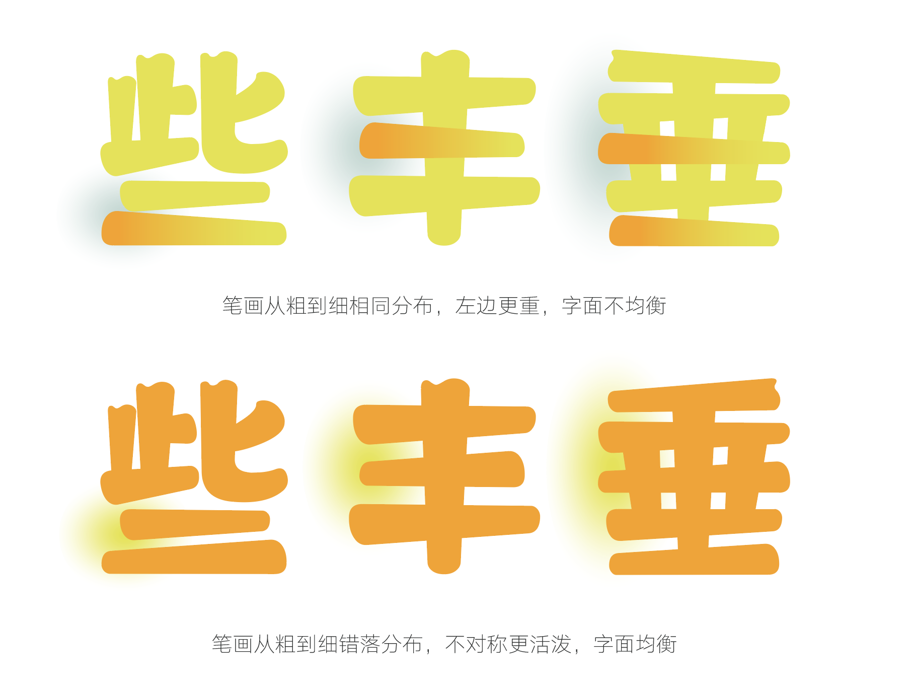 避免笔画从粗到细相同分布,让重量分布更均匀。不会出现所有重的笔画都在一边的情况。笔画不对称,更显活泼。