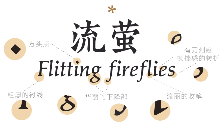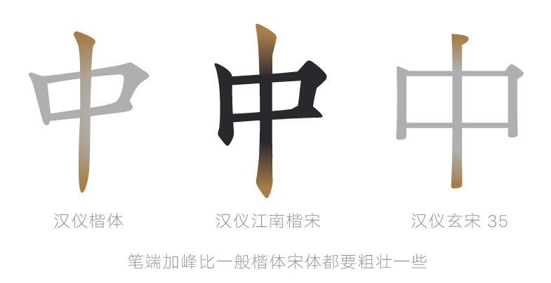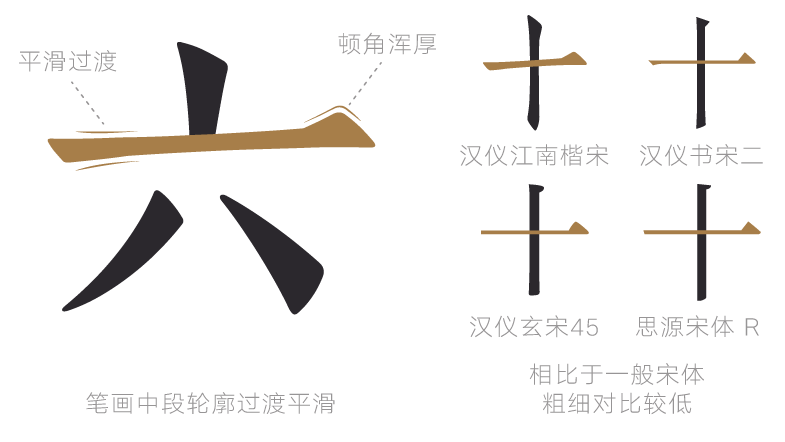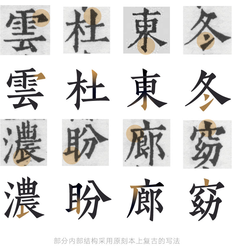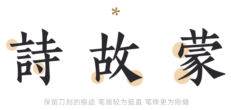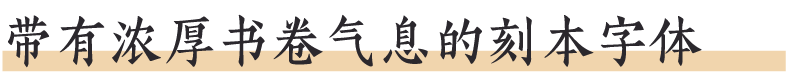 雕版反复印刷,笔画两端容易出现磨损。为尽可能印刷清晰,刻工会故意将笔画端点做的粗壮一些。这款字体也复刻了这一特点,笔画起笔收笔均有加峰,笔锋粗壮,给人一种静穆硬朗的感觉,带给人一种浓厚的书卷气息。