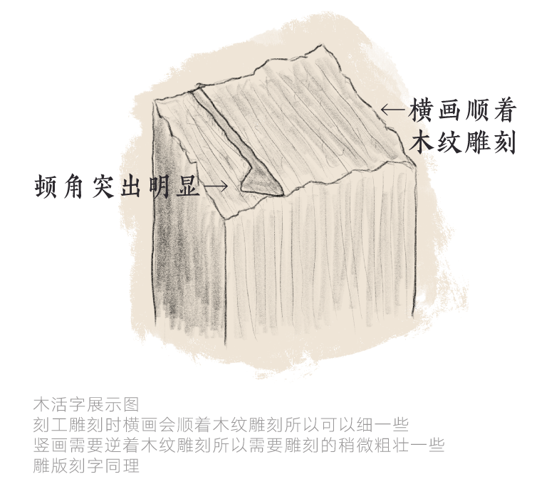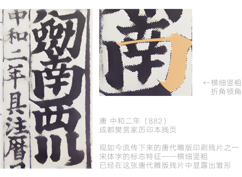 影响宋体字视觉造型演变的因素,除了效率外,所用的雕版材料也是重要的一环。雕版常用枣木、梨木等硬实的板材,横向用料,横笔可沿纹路切割,但纵向容易断裂,因此便将竖画做粗一些,宋体字横细竖粗的面貌便由此而来。同理,由于笔画的端点处容易破损,所以刻本字笔画端点处也会做得更粗一些。为了能避免纤细的横画经多次印刷后破损变得难以辨识,宋体字横画末端的顿角也是不断地被人为放大,以确保横画能被清晰辨认。