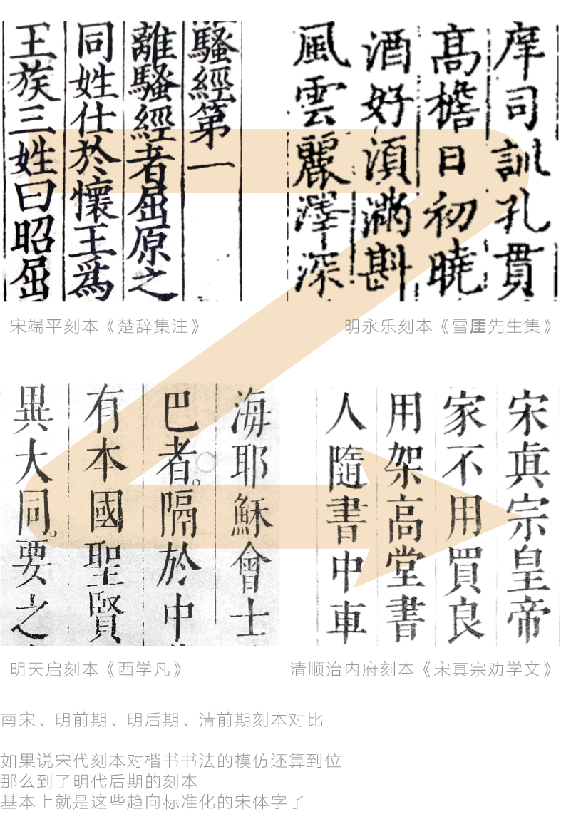 随着雕版印刷技术的出现,自唐朝开始,汉字的视觉面貌走向了两条完全不同的道路,开始了“写”与“刻”的分化。最早期的刻本,还都是以楷书书法字为主,是楷体书法在雕版上的再现。不过随着职业刻工的出现,写字这件事从一个人的书法变成一群人的集体劳动后,为了能够让整本书的字体清晰易读、风格一致,提高刻字效率,人们便开始了对刻本字形长达几百年的改造。