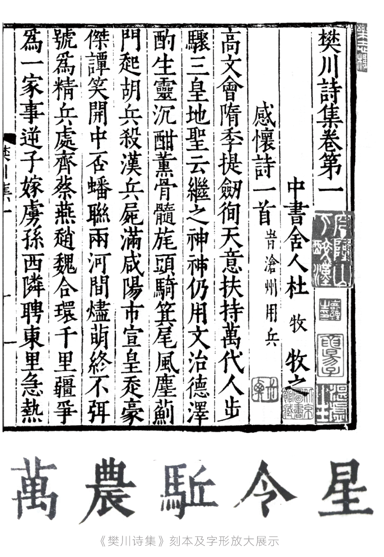 该本《樊川诗集》便是这一时期刻本复古运动的产物之一。该刻本字形风格处于楷书向宋体发展的过渡阶段,造型上既有欧体楷书的书写韵味的风格:字形结构欹侧险峻、书风工整严谨、笔画粗细对比较小等;同时又有许多宋体字的标志特征:笔画轮廓有明显刀刻感、点画形状接近几何体、横画末端有个顿角等。整体风格刚劲雄强、颇有明正德刻本的风味,综合来看,是明代欧体楷书刻本中的佳品。