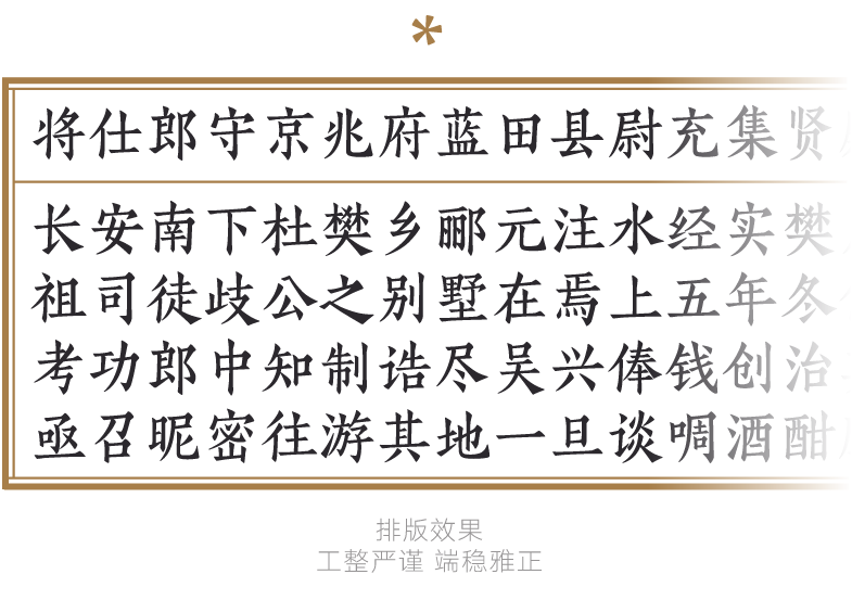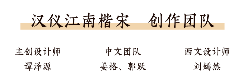 汉仪江南楷宋中宫紧收,字形微长,是一款极具欧楷风格的刻本字体。设计师对这款字做了细致的笔画规范,使得这款字可以有统一的视觉效果,排版后能给人一种工整严谨、端稳雅正的感受。