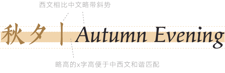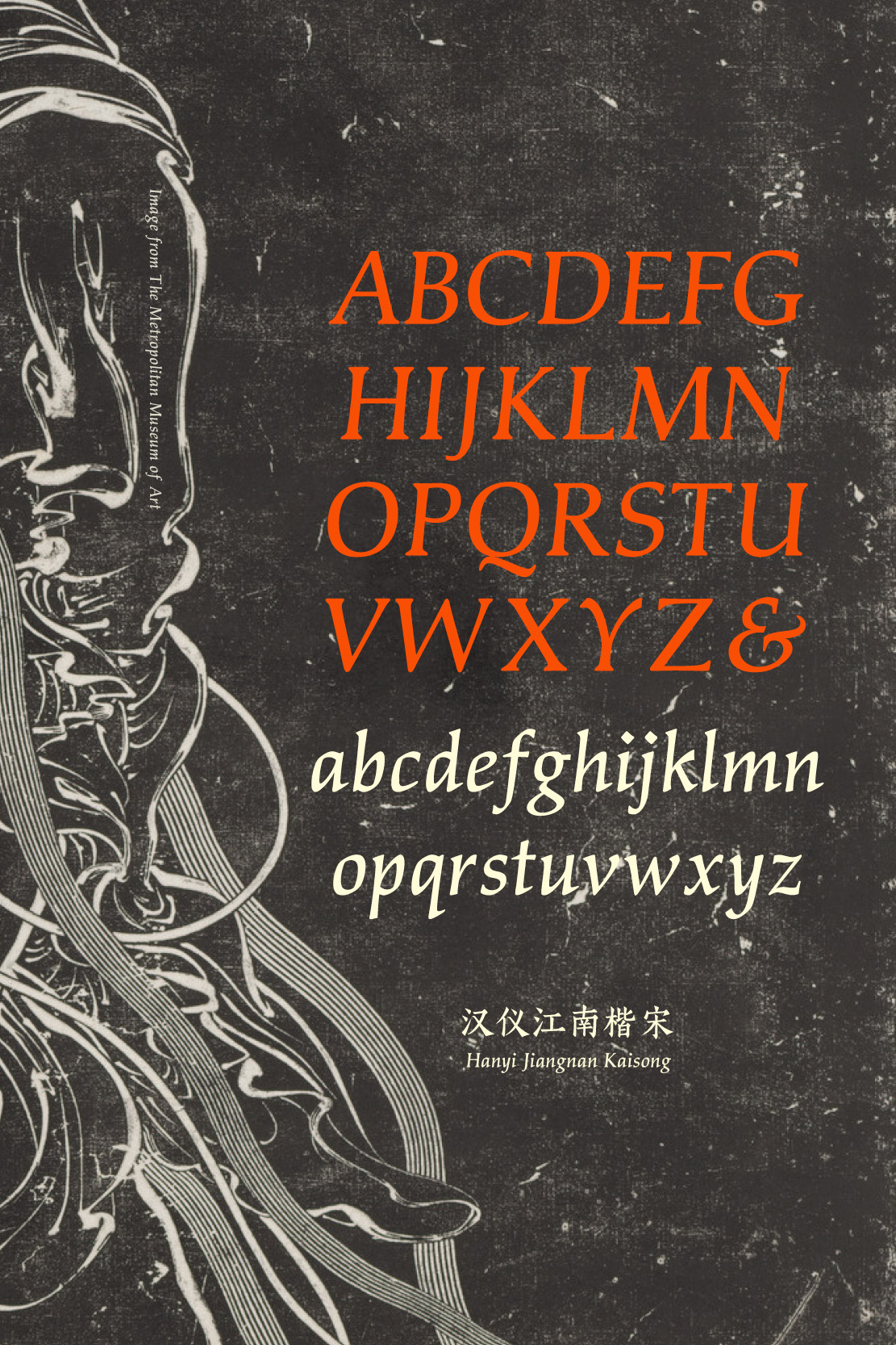 汉仪江南楷宋的西文部分,是由汉仪字库的西文设计师刘嫣然设计的。为了能和古朴文秀的刻本字体相匹配,汉仪江南楷宋的西文部分被设计成 upright italic 风格的字体,即一种既带有一些手写风韵,又带有垂直感的意大利体(斜体)字体。该字体衬线圆润粗厚,字干部分带有细微弧度,笔画粗细过渡自然,带给人一种古雅的书卷气息,完美契合中文部分的创作意图。