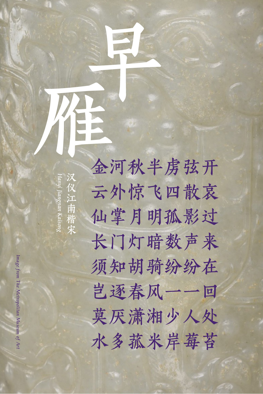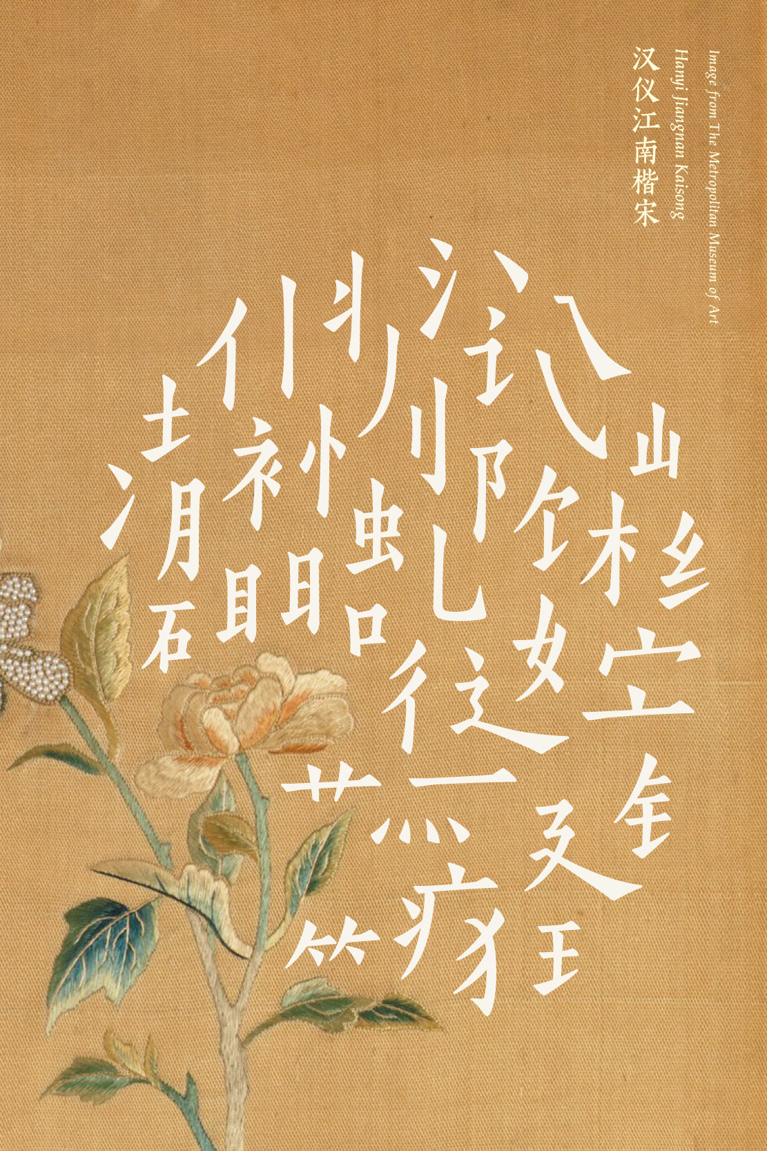 汉仪江南楷宋是由汉仪字库字体设计师谭泽源设计的一款集楷体、宋体韵味于一身的刻本风格字体。该字体脱胎自明正德年间的浙本《樊川诗集》,是刻本字体由楷入宋时期的代表刻本。该字体结构端稳雅正、造型古朴文秀,点画刚中寓柔、静穆硬朗。适合用于产品包装、广告海报等各类需要展现传统文化、匠心营造的场合。