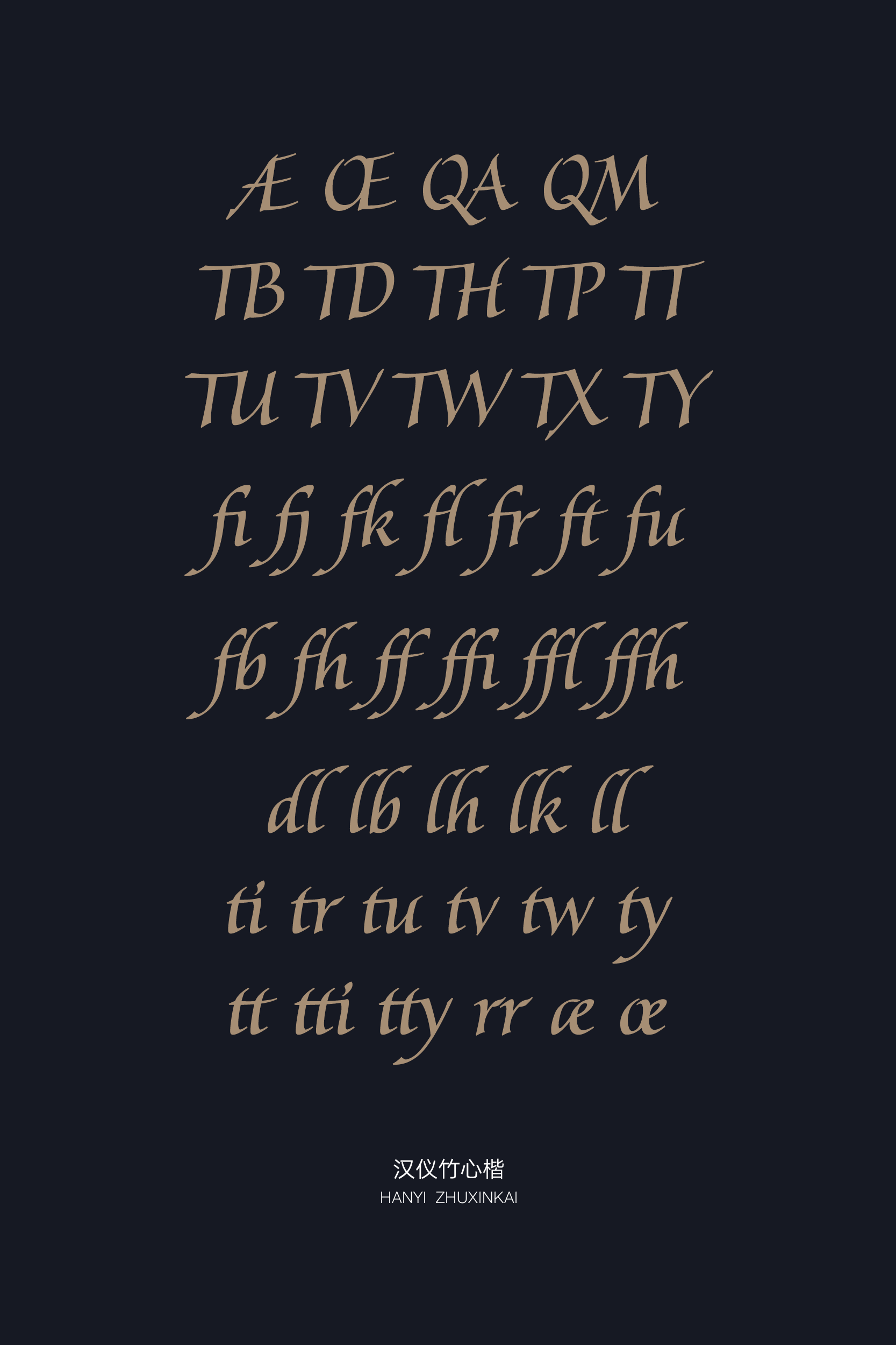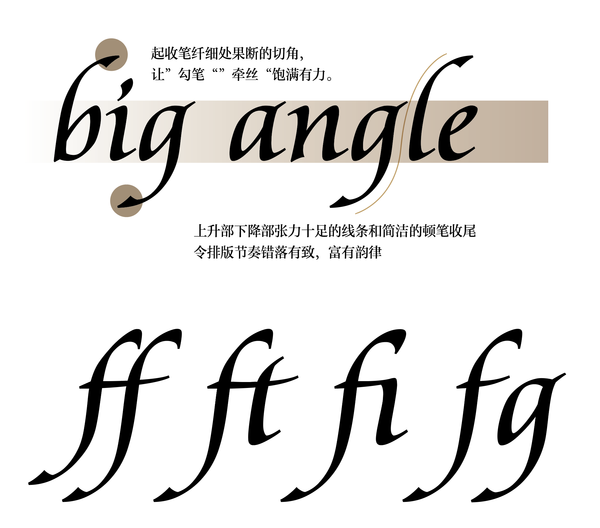 字库中包含了40余种自动连字,包括西文设计中常见的组合fi ft tt等,以及解决本字库特定字母组连接问题的组合,为使用者提供更加流畅的排版体验。