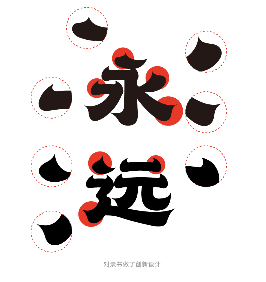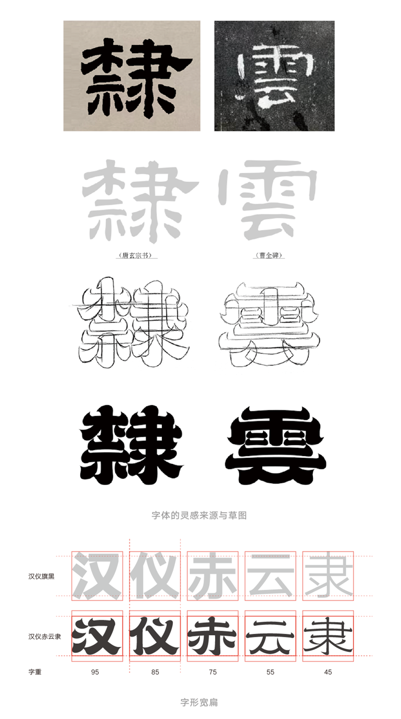 为平衡传统中式风格与现代时尚有设计感风格之间的矛盾,“汉仪赤云隶”从设计角度对传统隶书进行了大胆地创新。它打破了隶书雁无双飞、蚕不二设的传统,将一个字中的仅有的大波磔,分散转化成数个小“火焰”,视觉上比传统隶书更加繁复缤纷。字形间架结构被设计的更加对称、平衡,符合当下文字审美。