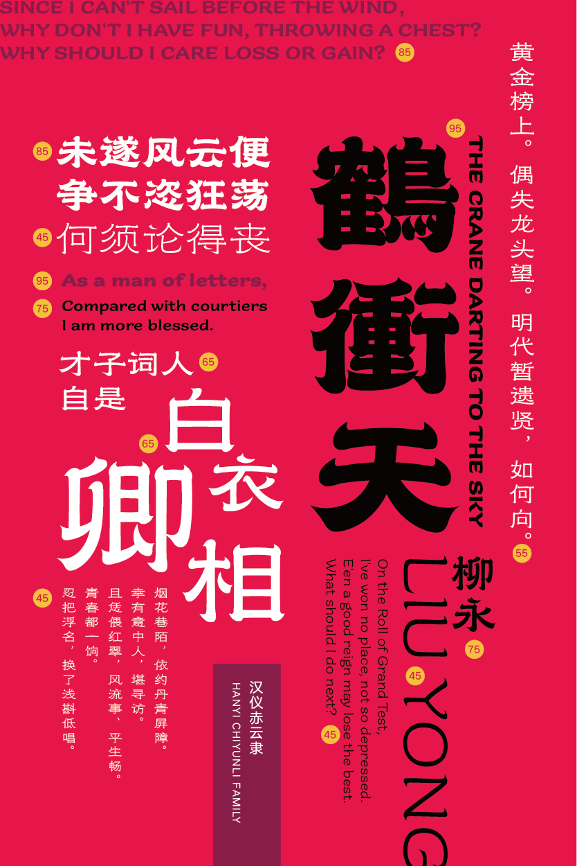 “汉仪赤云隶”目前已成功实现字体家族化,该字体家族总共包含6个字重:45/55/65/75/85/95,更多的字重,可以满足不同视觉层级的需求,为设计师排版提供更丰富的解决方案。