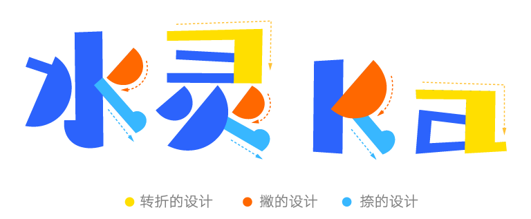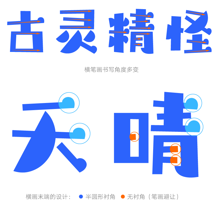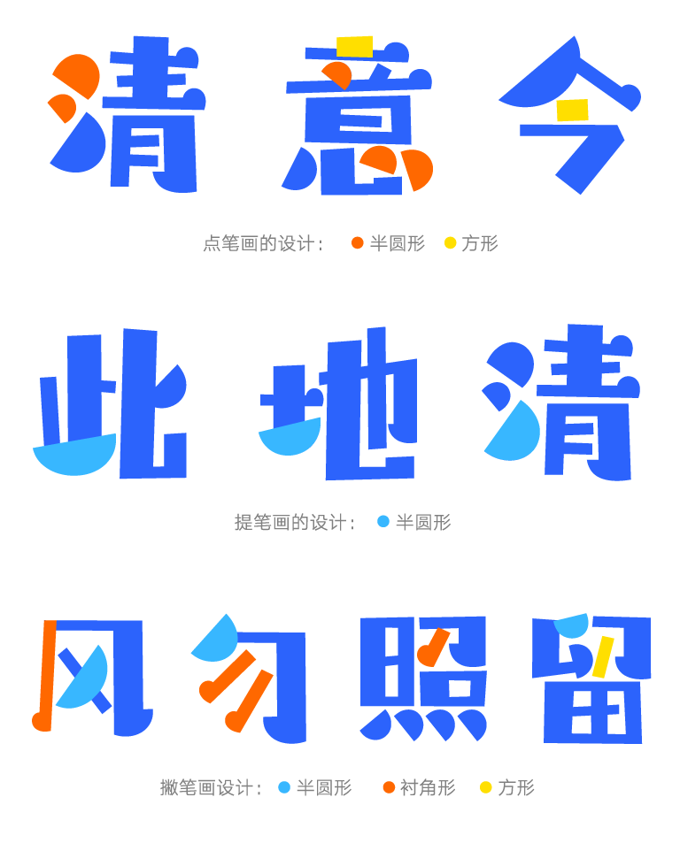 设计师将这款字的点、提和撇的笔画设计成半圆形,根据笔画位置的不同,半圆形笔画的大小和角度有不同的变化。依据笔画结构的安排,为了避免过多半圆形的碰撞,部分笔画采用其他的形态,使得字体笔画的组合更加协调舒适。