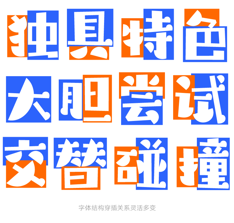 这款字体在笔画设计上有着夸张的粗细对比和方圆对比,张弛有度,凸显字体的俏皮有趣。
