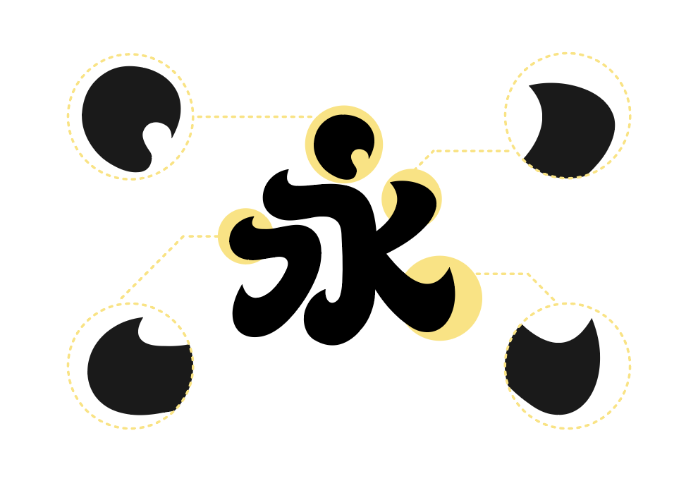 “汉仪铸字旺财”的点笔画十分饱满,它根据部首的不同而设定为月牙形和长钩形。笔画曲线柔和流畅,如行云流水一般。