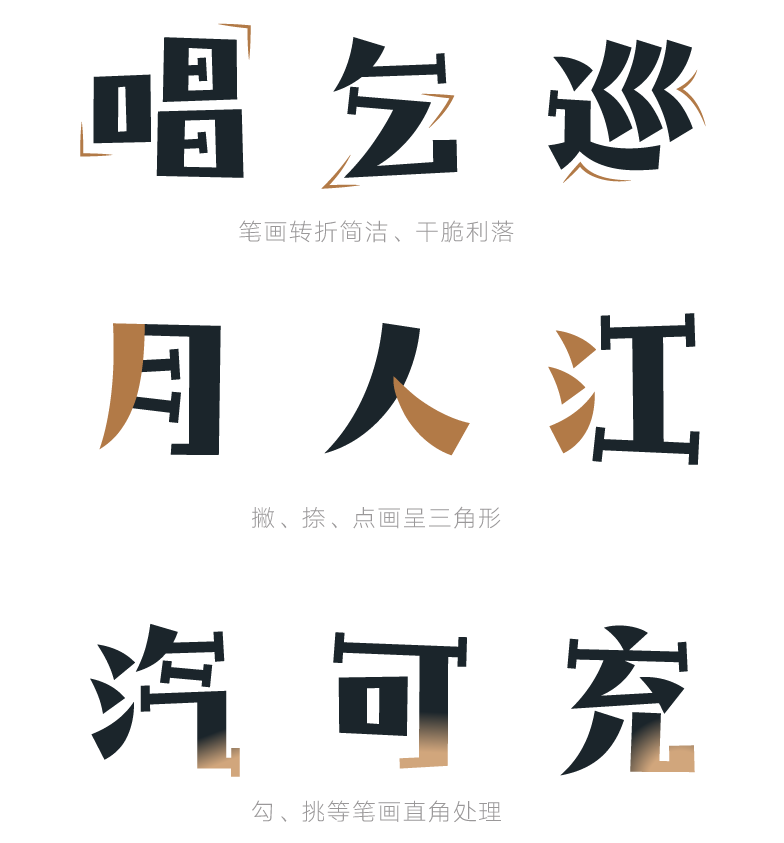 这款字的笔画设计干净利落:笔画基本由线段组成,转折简洁无装饰,撇、捺、点画呈三角形锐利充满叛逆感,勾、挑直角处理为字形增添趣味性。