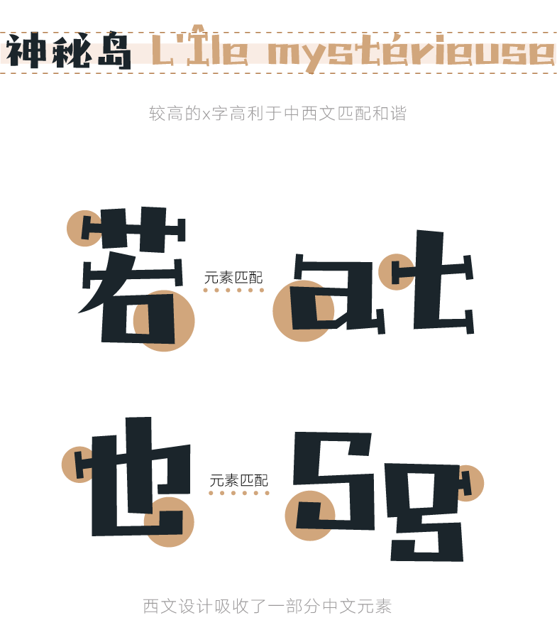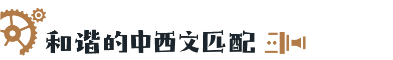 这款字的西文部分设计参考了中文的设计思路,字形全部采用直线设计,每一笔都有一定的倾斜,并在字形中增添螺母装饰,使得字形看起来俏皮可爱。中西文排版后和谐统一。
