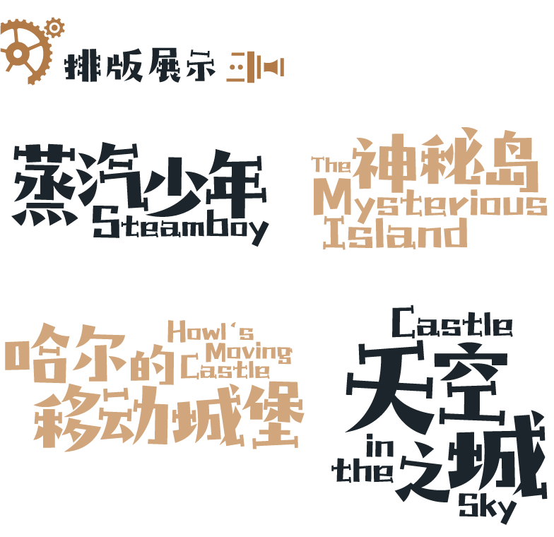 该字体结构轻松不羁,每个笔画都成一定角度倾斜,字面也随着字形结构的变化而有轻微的宽窄高低的波动,带来蒸汽科技的动力感,和爵士乐一样的怀旧韵律感。