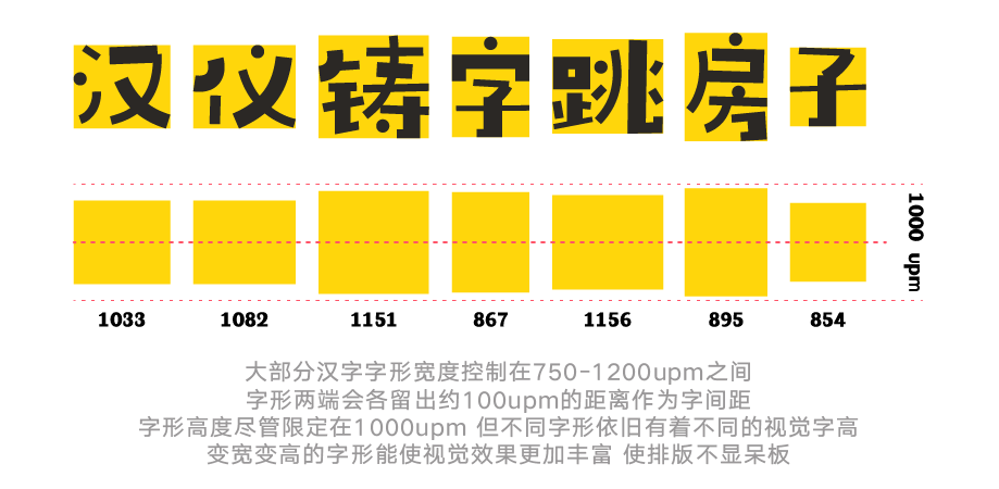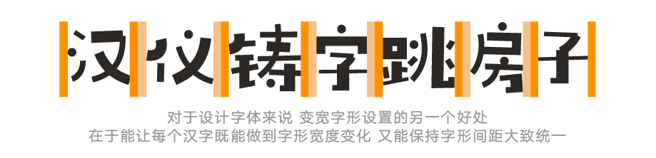 汉仪铸字跳房子是一款变宽字体,字形的字宽字高会随着每个字不同的字形结构而发生变化,使得整款字体字形结构灵活有趣、富有变化,字间距安排更加合理得当,排版效果更加舒适自然,符合正常的阅读习惯。