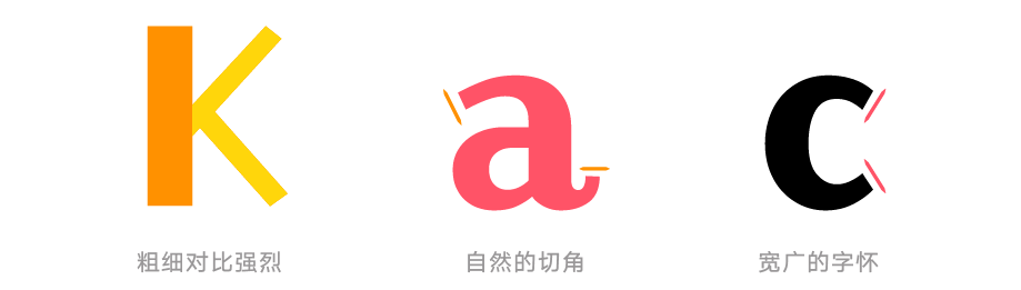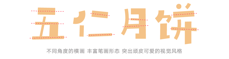 这款字体中宫放松,中心偏低,结构灵活,每一个笔画虽然都有不同角度的倾斜,但是整体字形却能稳定排布在字形框内。这使得字形看起来更加灵活,更加俏皮。