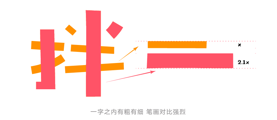 该字体笔画粗细变化差异大,对比强烈。字体粗细变化看似毫无规律,但主次分明,疏密分布合理,在保持字形平衡的同时为字体增添跳跃感。