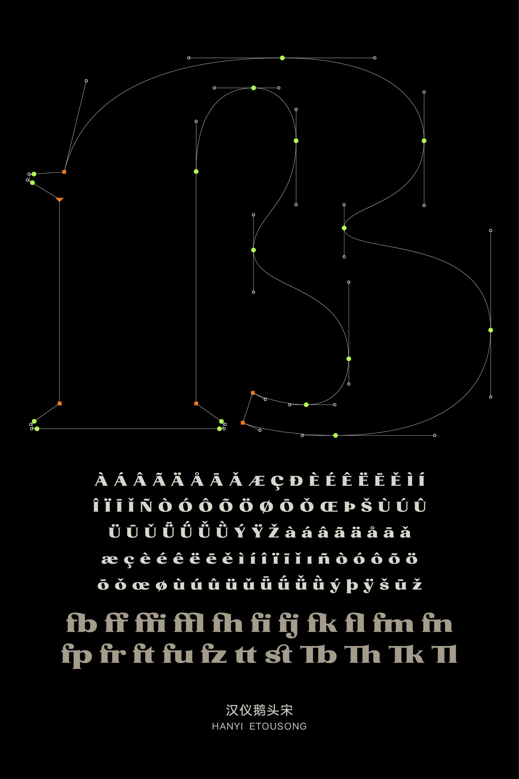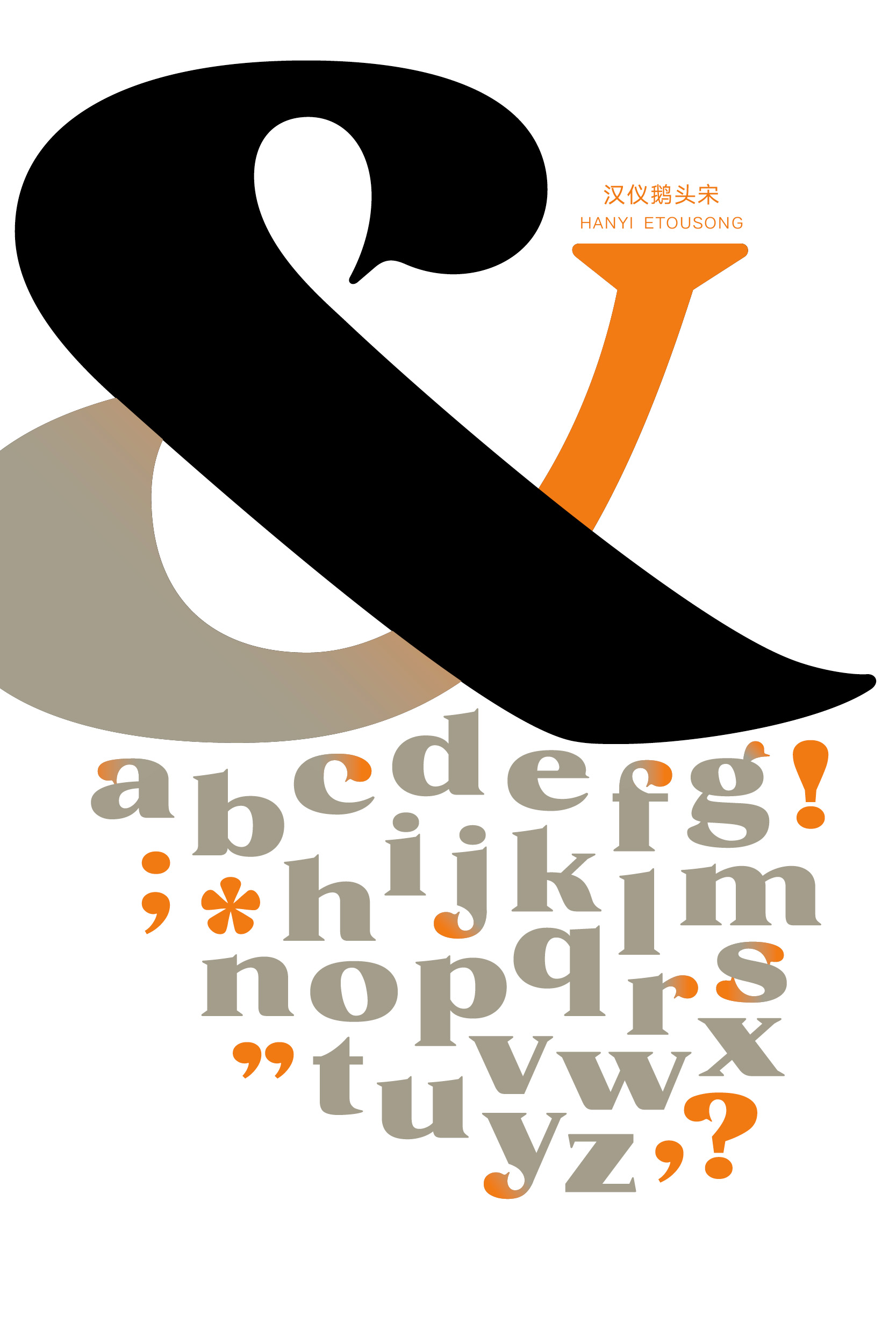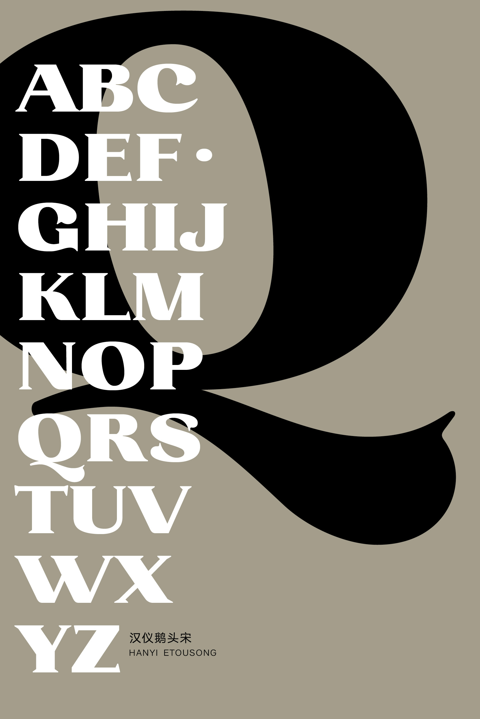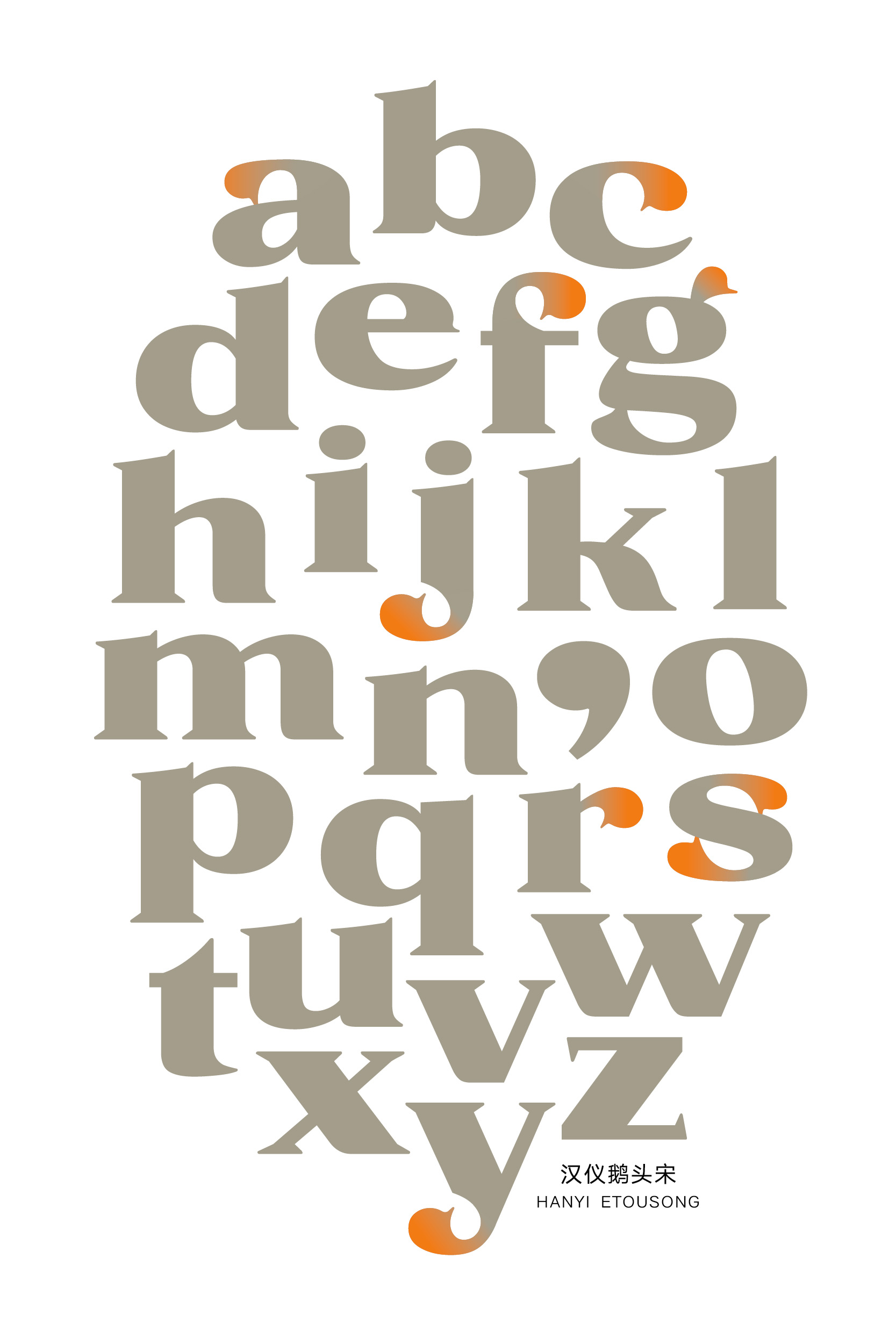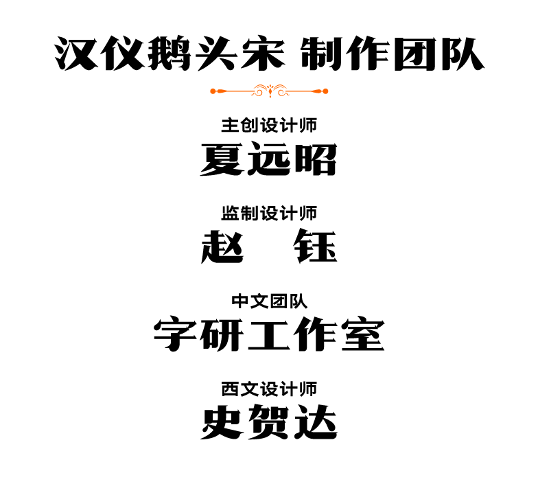 汉仪鹅头宋的西文部分由汉仪字库的西文设计师史贺达设计。设计师以Fat Face风格现代衬线体为参考进行设计,垂直笔画浑厚,衬线硬朗,醒目时尚。设计师将中文笔画众多鹅头勾造型融入到西文设计中,使得字体造型看起来风趣幽默,有较强的装饰性。