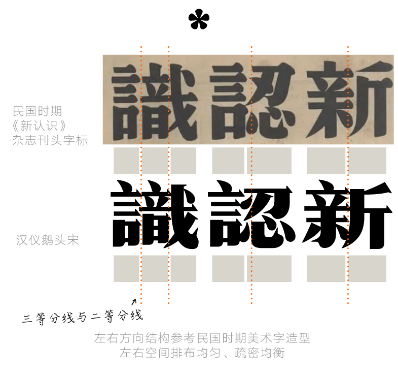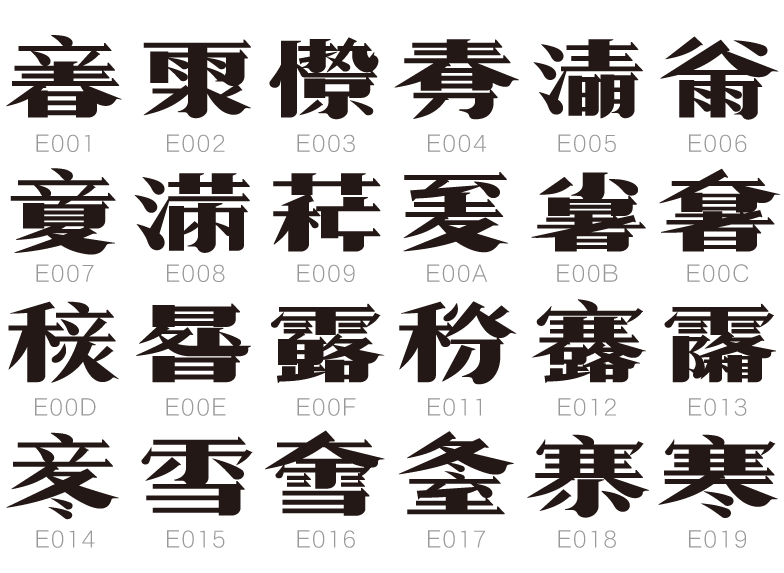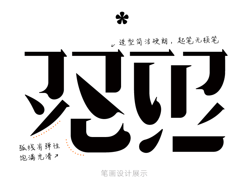 这款字体笔画紧凑,结构上紧下松,符合传统书法审美观点。但在左右方向上追求造型对称,笔画均衡,疏密匀称,属于从美术字中获取的结构灵感,为字形增添了许多稚拙之趣。