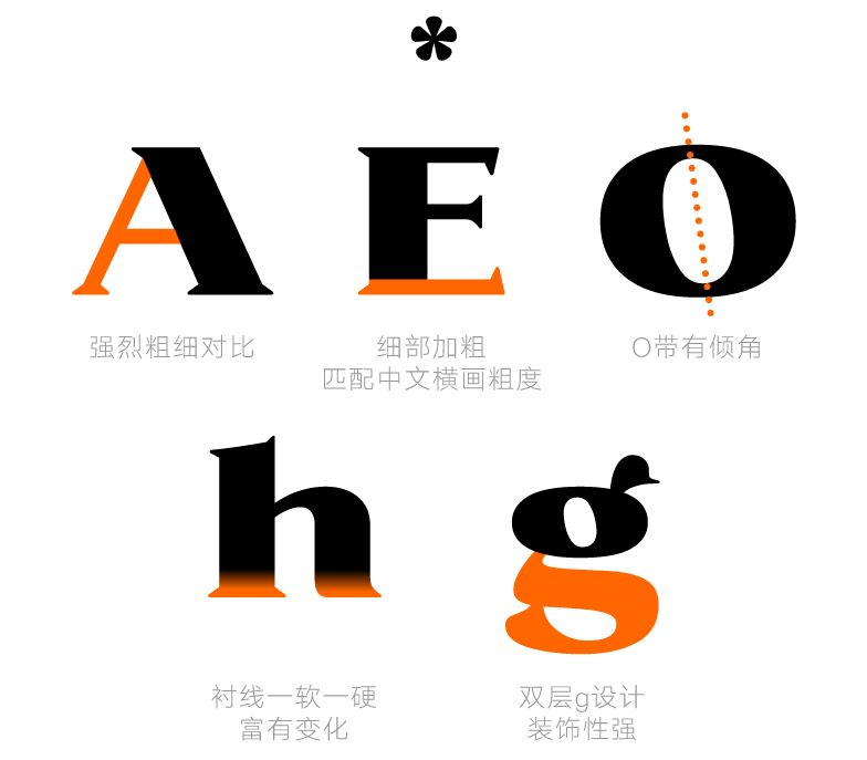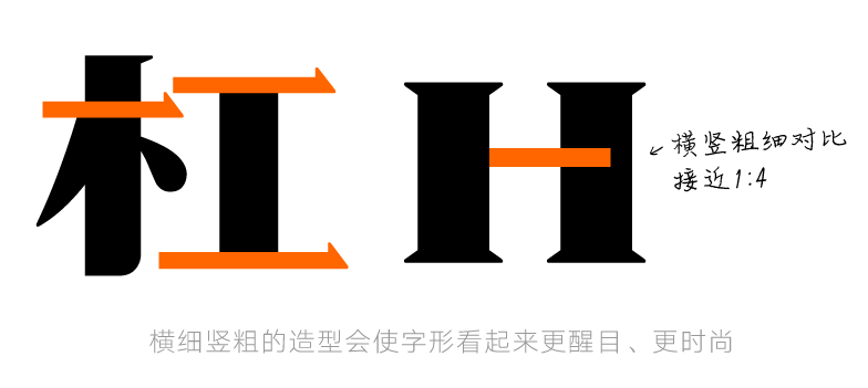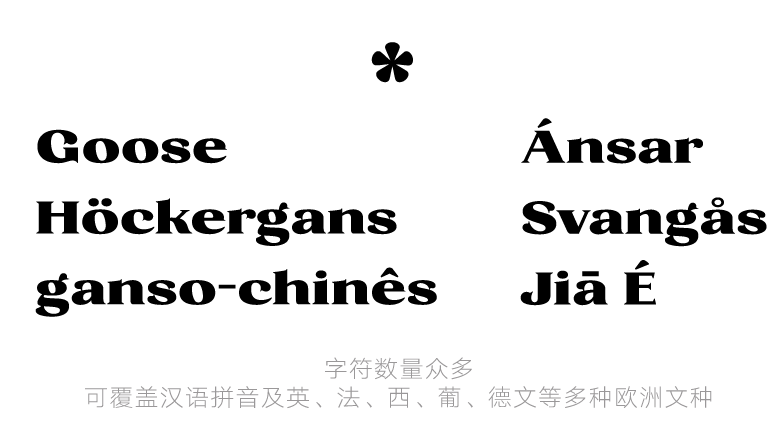 为了展现摩登时尚的气质,汉仪鹅头宋的笔画设计参考了现代风格衬线体西文的造型。该字体横细竖粗,有着强烈的粗细对比,笔画轮廓曲线简洁硬朗,使得字形看起来醒目饱满、情绪激昂。