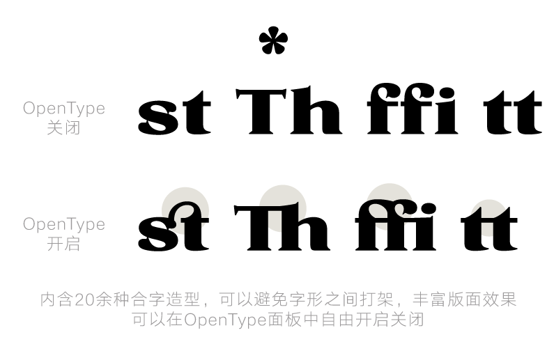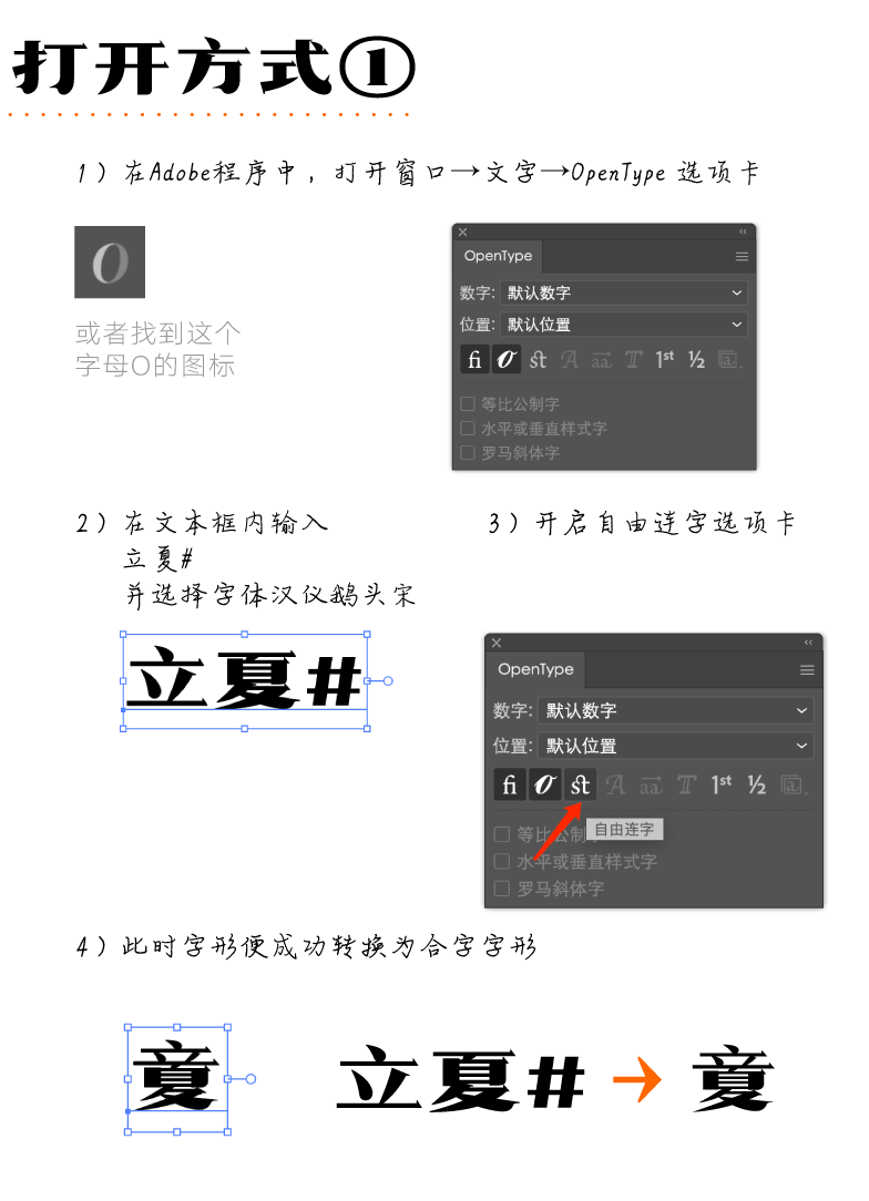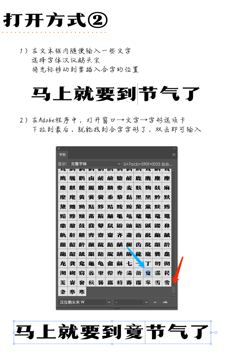 设计师考虑到这款字体在民俗文化传播上的用途,专门为鹅头宋设计了一套二十四节气合体字。在Adobe软件内,打开OpenType选项卡,选择开启自由功能,输入“节气名称+#键”(如立夏#)就能把这些合体字打出来了。