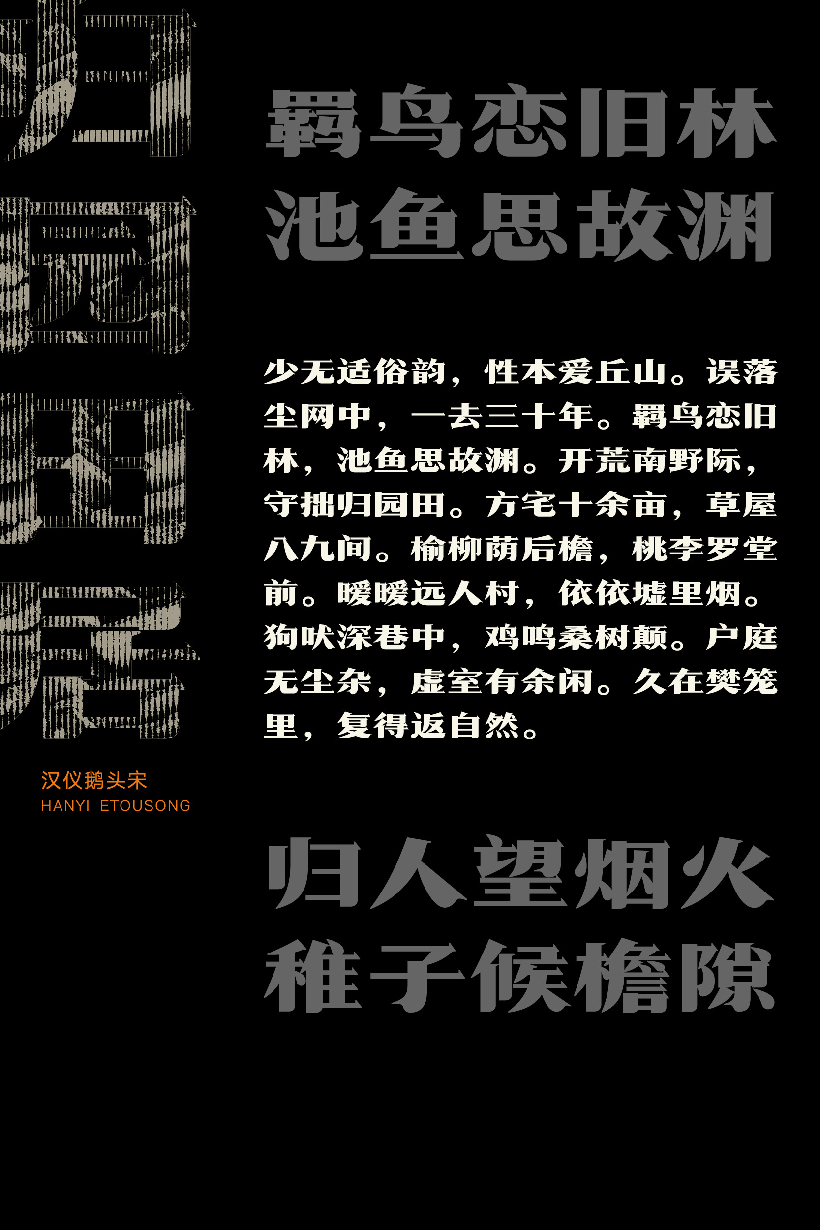 汉仪鹅头宋是由汉仪字库签约设计师夏远昭老师设计的一款带有复古风韵的标题宋体字。设计师分别从雕版宋体字、民国宋体美术字和当代印刷大宋体中汲取灵感,造型敦厚拙朴、笔画饱满激昂,如同漫步在时光的长廊中,怅祁寒暑雨、听春鸟秋蝉、忆峥嵘岁月、思二八华年,充满了时代气息。因此该字体适合作为标题字,用在时令节日、展会表演、民俗娱乐、餐饮休闲等场合,来营造怀旧复古、喜庆吉祥的气氛。