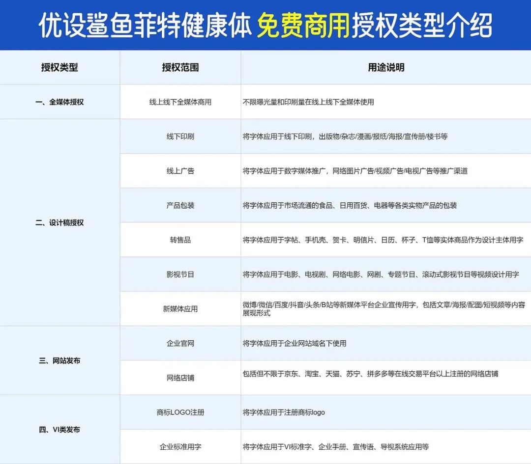 最后重要的事情说三遍,优设鲨鱼菲特健康体免费商用!免费商用!!免费商用!!! 具体范围可查看下图: