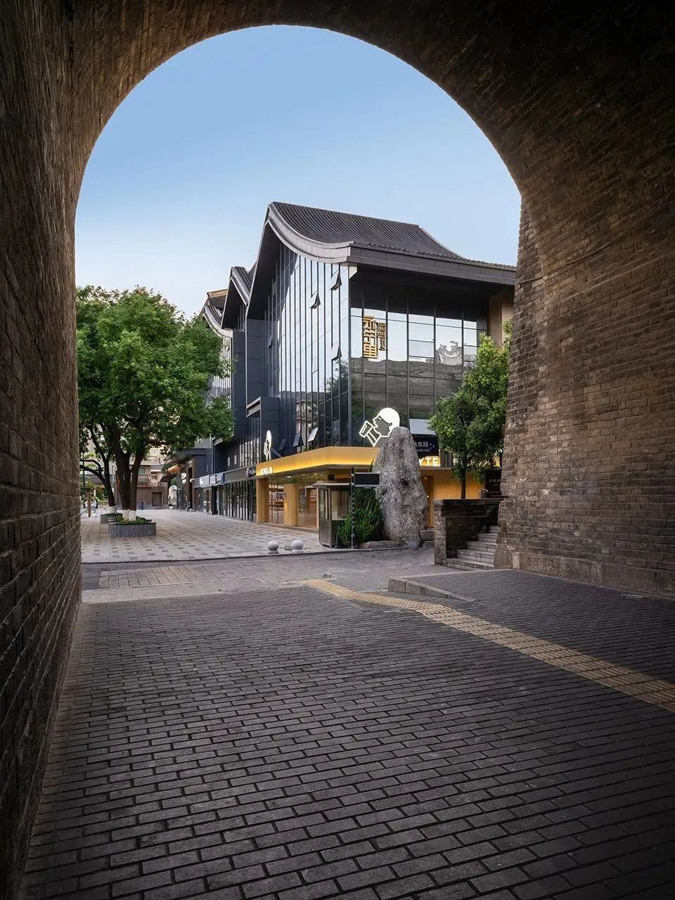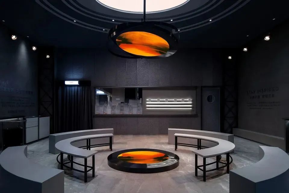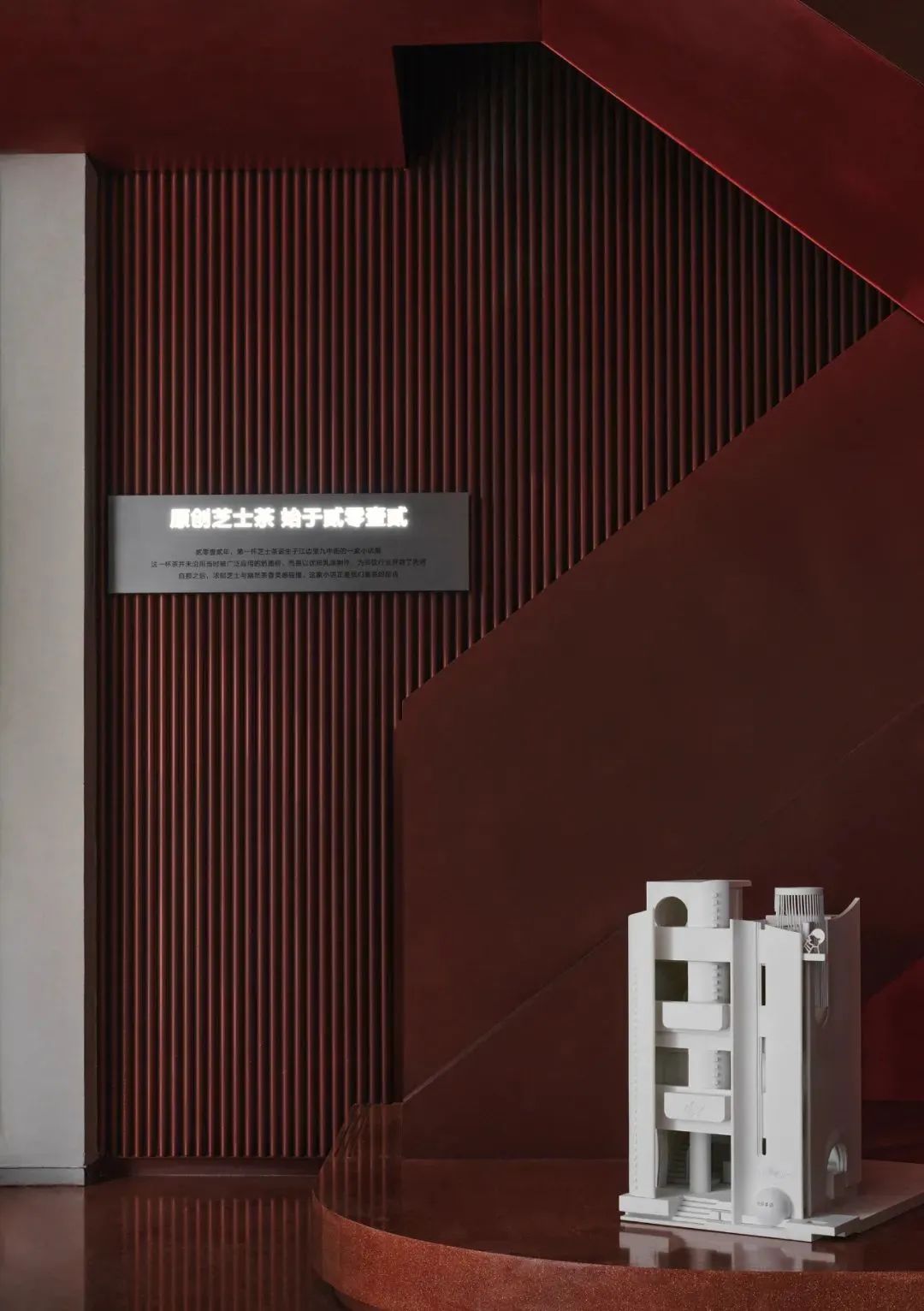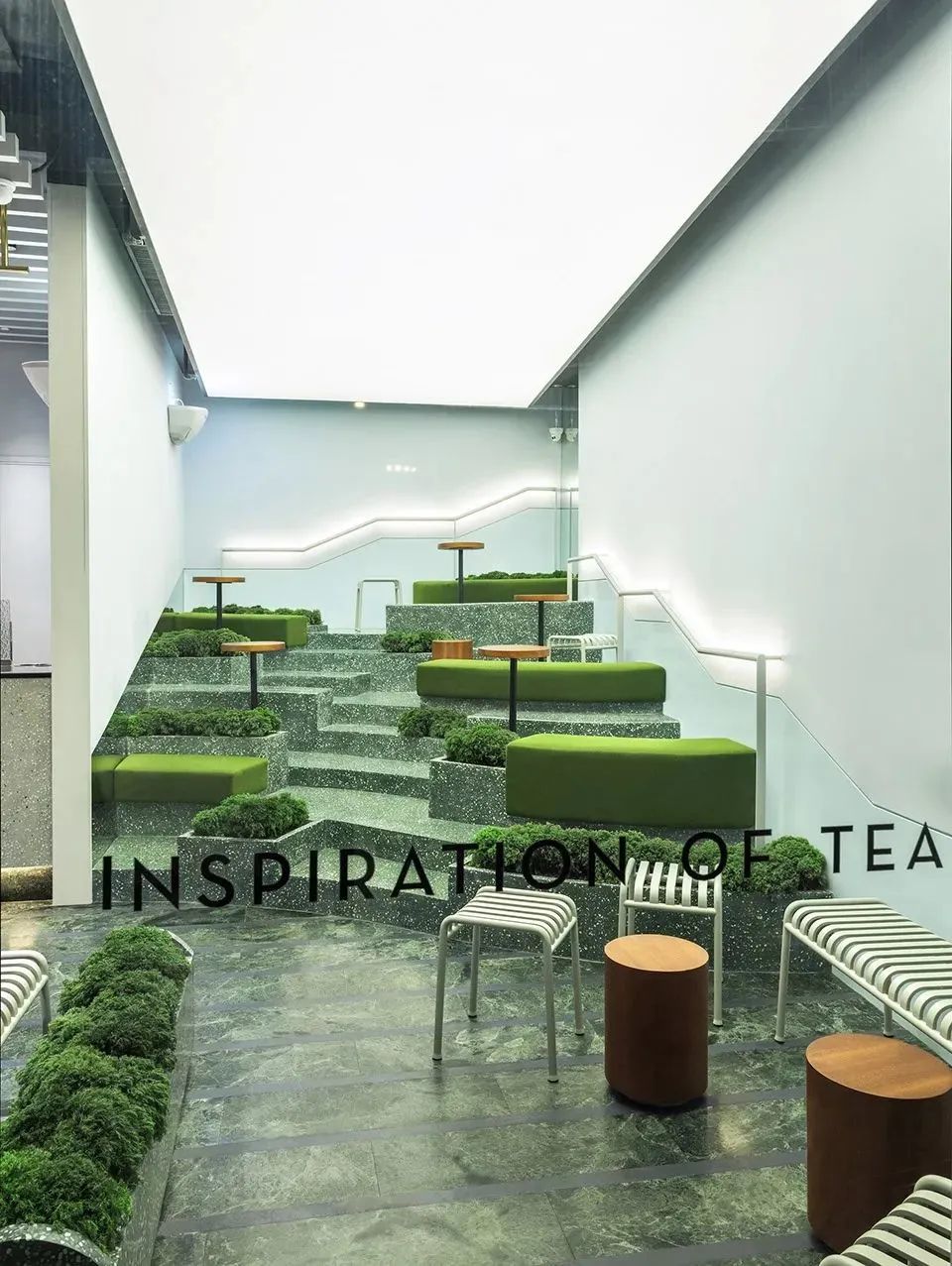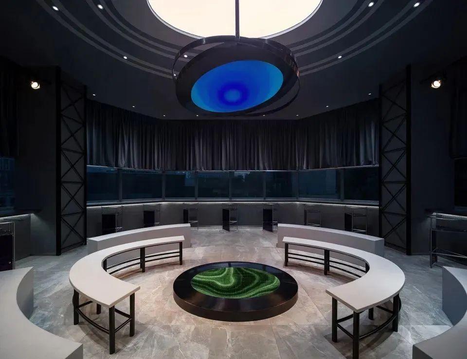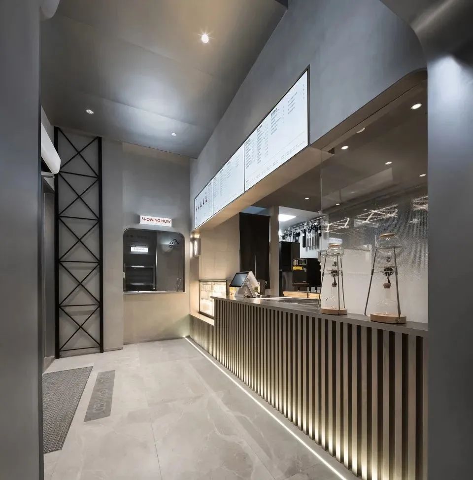 一幢独立六角形小建筑,希望可以在不大的空间里注入进戏剧的张力。充满复古元素的剧院门头,就很有上海摩登都市的氛围,满满的仪式感。售票窗口、剧院进场门、丝绒帘幕,同取茶、收银的实际功能无缝结合,从外面便可以窥见室内剧场灯光和变幻的天幕LED屏。
