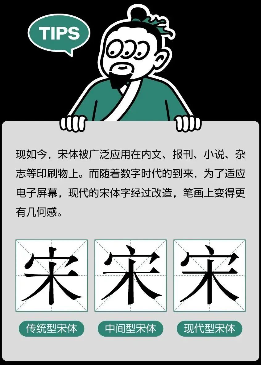 因为这些刻本都是在木板上雕刻的,所以匠人们为了省时省力,会将横画刻的很细,而竖画过细容易损坏,不利于反复使用,所以就形成了现在宋体横细竖粗的笔画特征。而对于曲线笔画的处理通常是“能省则省”,横竖笔画绝对平直,起笔落笔都有棱角。