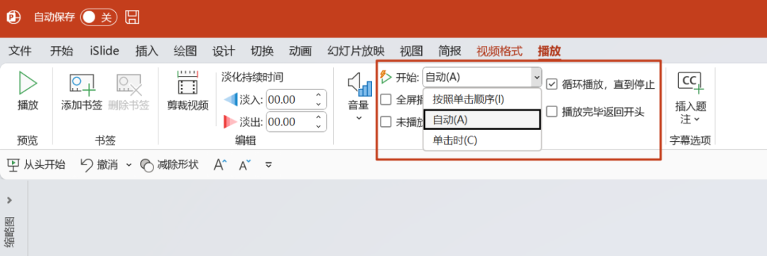 插入视频后,在播放选项卡选择自动开始、循环播放:
